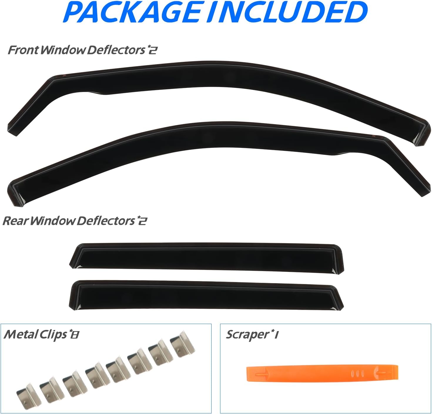 - ăIn Channel Designă CHYKORLA Window vent visors install in the window channel, provides perfect fit and sleek look for your car. Come with 4 pcs side window deflectors, 8 pcs clips, 1 pcs plastic Crowbar for a durable and secure installation. No complicated instructions are needed. Attention: Please apply the clip to fix the rain guards