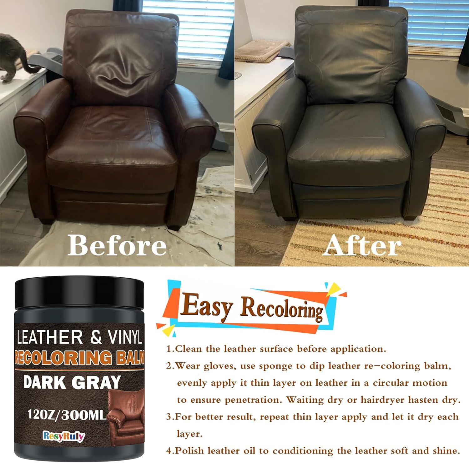 - Easy Application & Quick Drying: Dary gray leather recoloring balm effortlessly restore your leather and vinyl items with a simple application. Dark gray leather dye dries quickly, saving you time, ensuring a smooth and professional finish