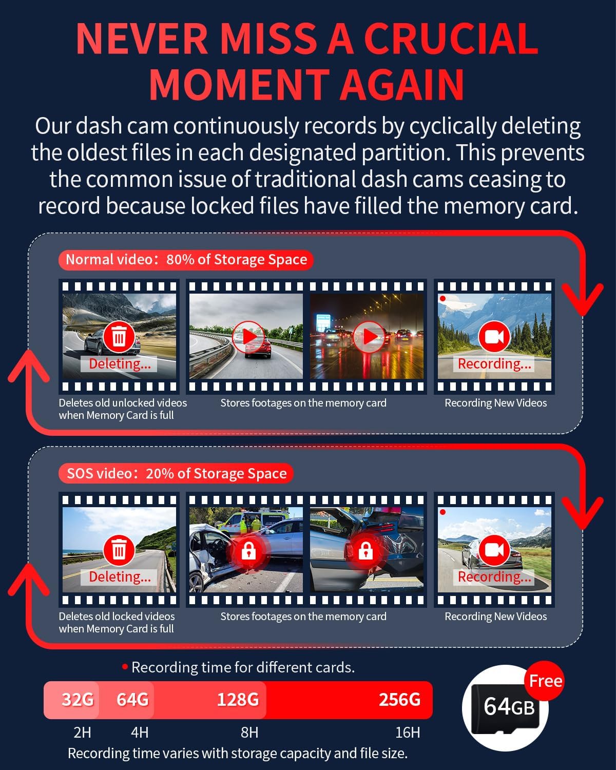 - Memory Card Failure Alert to Protect Data: When the memory card fails (due to damage, disconnection, or incompatibility), the dashcam emits a continuous "DIDI" audio alert to prompt the driver to take immediate action, preventing recording interruptions. Dual storage loops independently to ensure that every second is securely recorded without interference between emergency and regular videos.