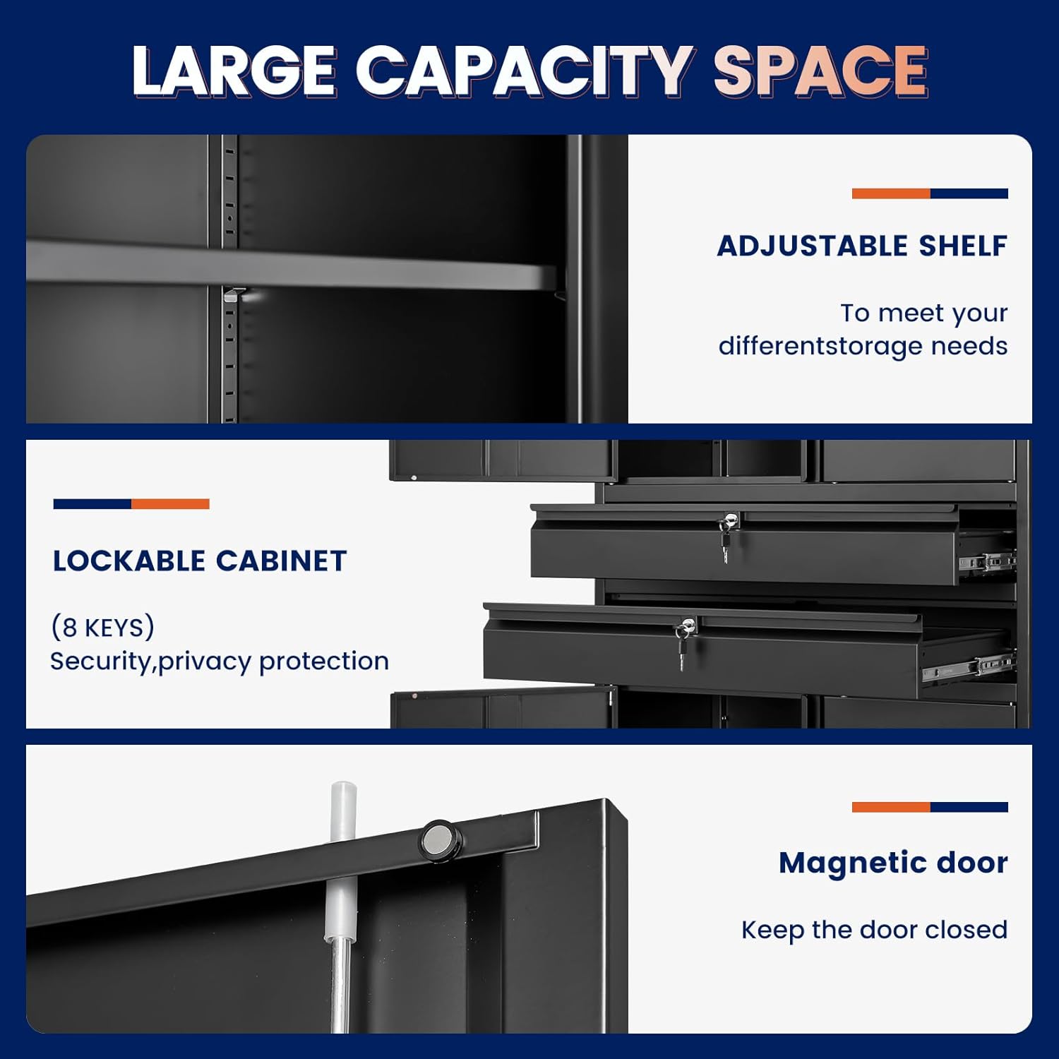- 『WEIGHT CAPACITY』: Sturdy and reliable - each of the shelves in this tall cabinet can hold up to 180lbs,With a heavy duty metal frame, these shelves will stabilize their contents and protect them.Whether you want to store office files, garage tools, or other large and heavy items, it's no problem.