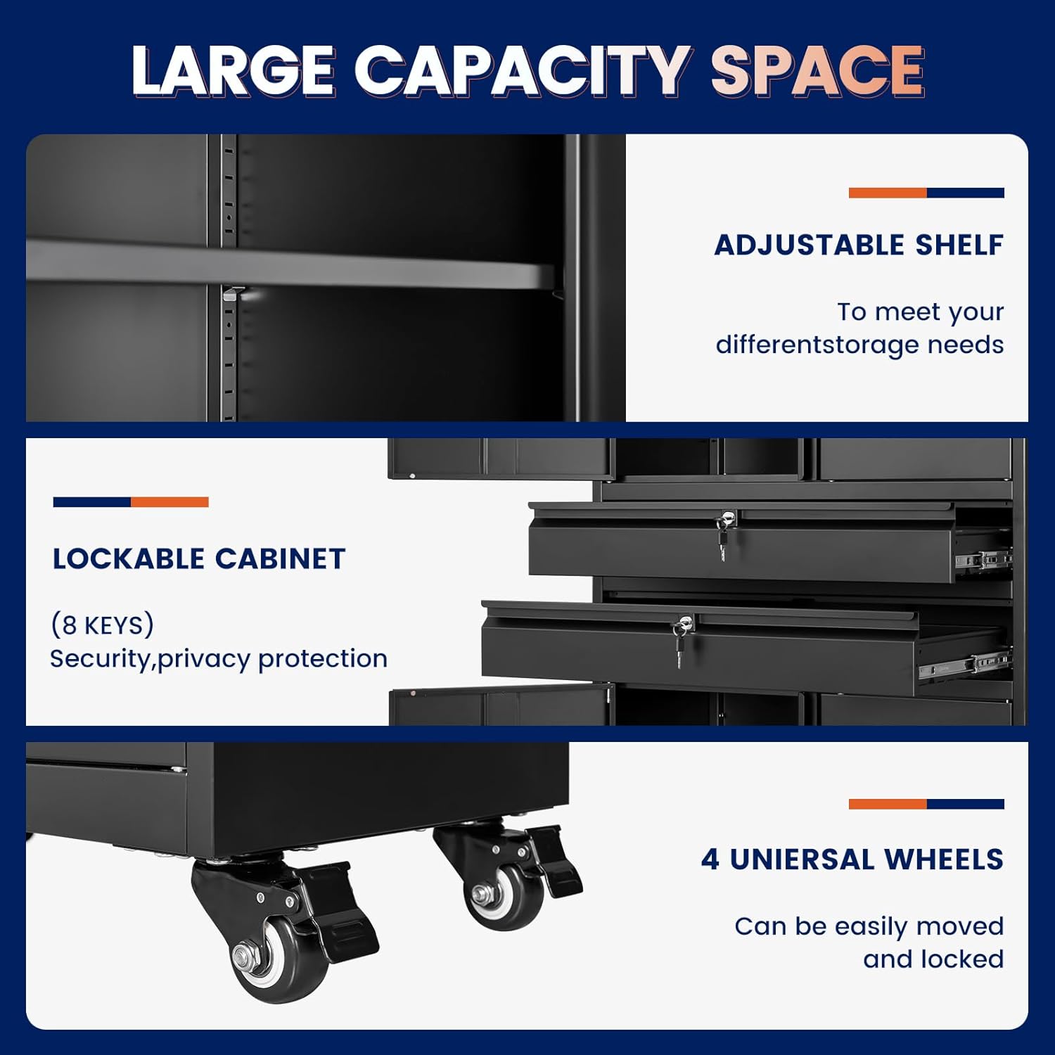 - 『PRACTICAL DESIGN』:Our tall metal cabinet equipped with 2 drawer and 2 adjustable shelves to provide adaptability and convenience. Wheels(2 lockable wheels) with 360° rotation can easily move to anywhere & stay in a fixed position. High-grade lock picking to secure valuables.cabinet has three locks each with two keys,regardless of what your storage needs are, you have the ability to create a unique storage space to suit them.