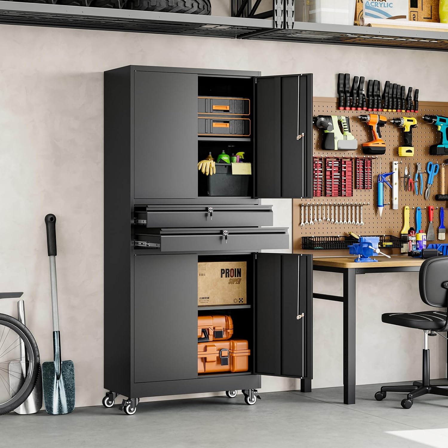 - 『WEIGHT CAPACITY』: Sturdy and reliable - each of the shelves in this tall cabinet can hold up to 180lbs, With a heavy duty metal frame, these shelves will stabilize their contents and protect them.Whether you want to store office files, garage tools, or other large and heavy items, it's no problem.