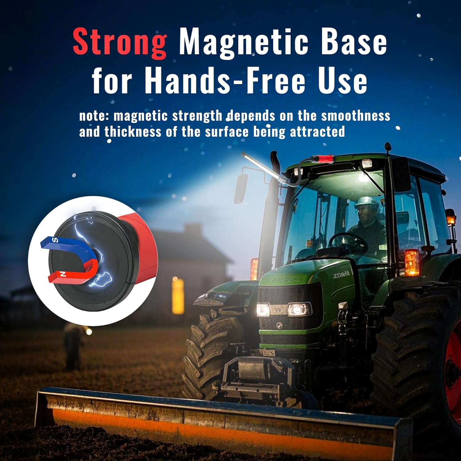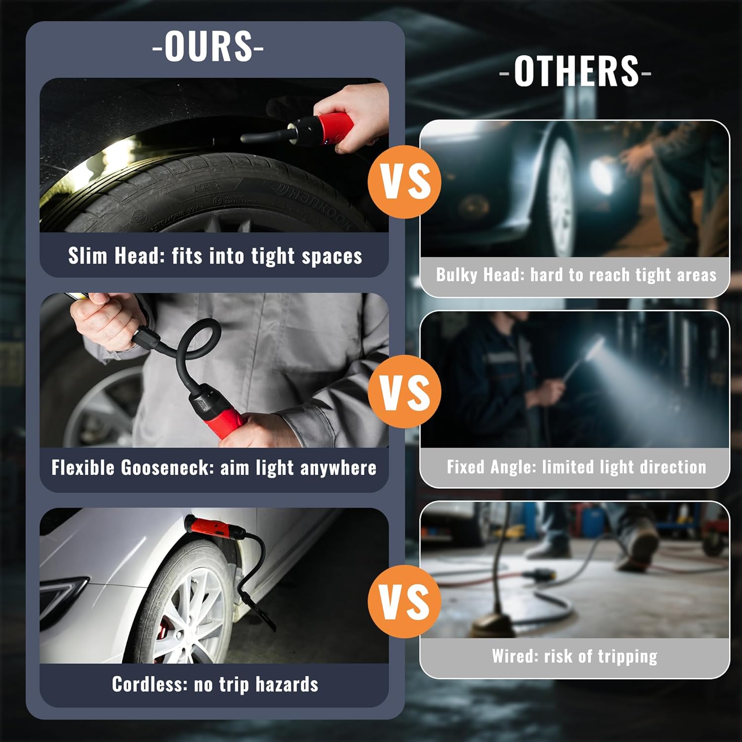 - 360° Flexible Gooseneck: Easily direct light exactly where you need it. Perfect for hard-to-reach areas, tight spaces, or awkward angles during garage and workshop tasks. Note: Avoid standing upright on non-metal surfaces to prevent tipping