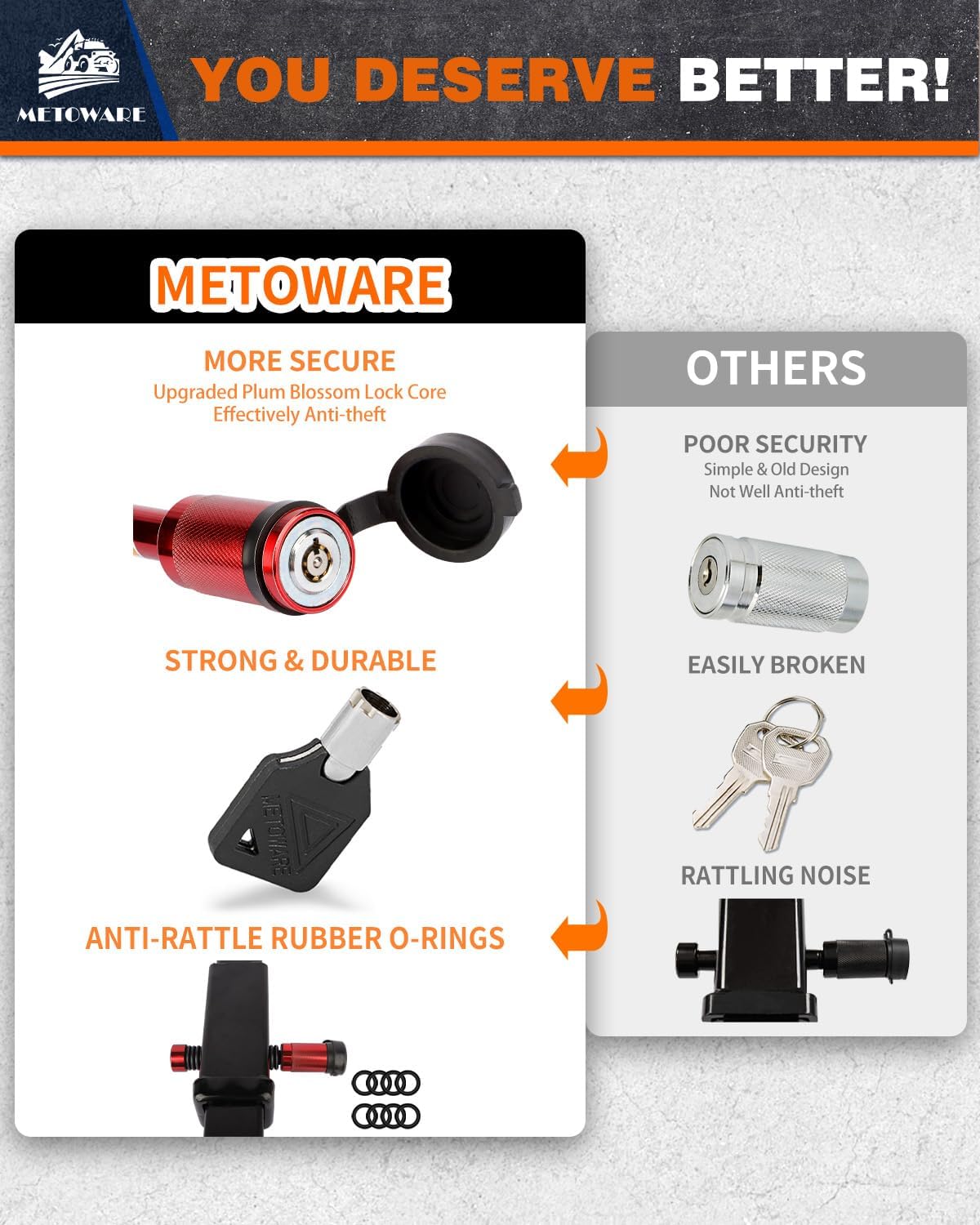 - VIBRATION AND NOISE REDUCTION: The hitch lock includes 8 rubber O-rings for shock absorption and noise reduction, providing a smoother and quieter towing experience.