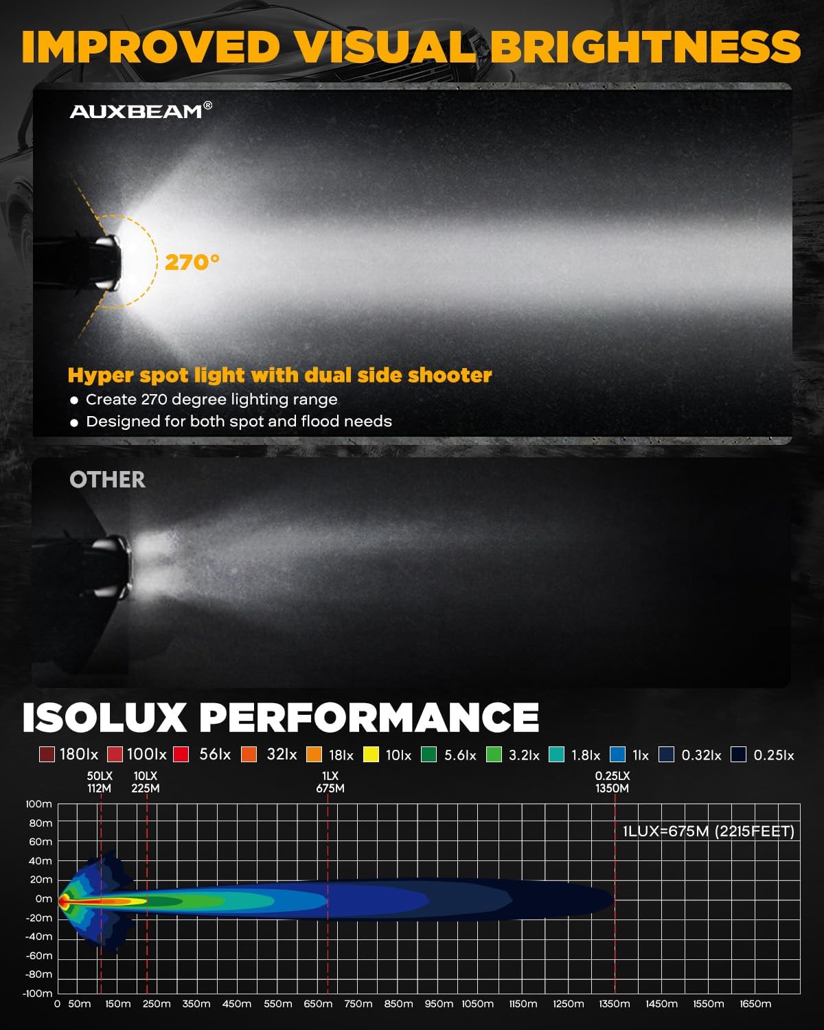 - 【Shine Bright Like a Rockstar】Turn night into day with 226W of P8 LED and 2835 SMD brilliance! With a massive output of 26,800 lumens, you’ll see up to 2215 feet at 1 LUX. Experience precision beams that eliminate glare and enhance clarity, making every adventure unforgettable with Auxbeam V-Ultra Series!