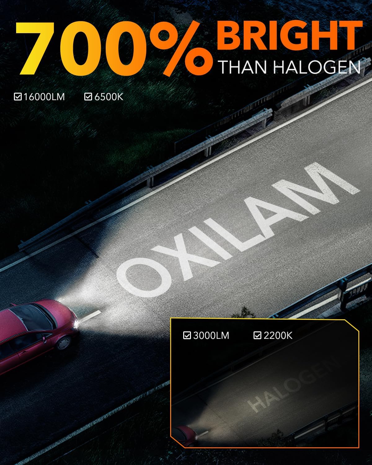 - 56,000 LUMEN AND 6,500K COOL WHITE: Illuminate the road ahead with unparalleled brightness using OXILAM H11 9005 LED bulbs combo. With high-grade CSP chips, these bulbs offer a staggering 700% brightness compared to halogen bulbs, ensuring a clear and focused beam for enhanced visibility during nighttime driving. Say goodbye to dim and blurry halogen bulbs