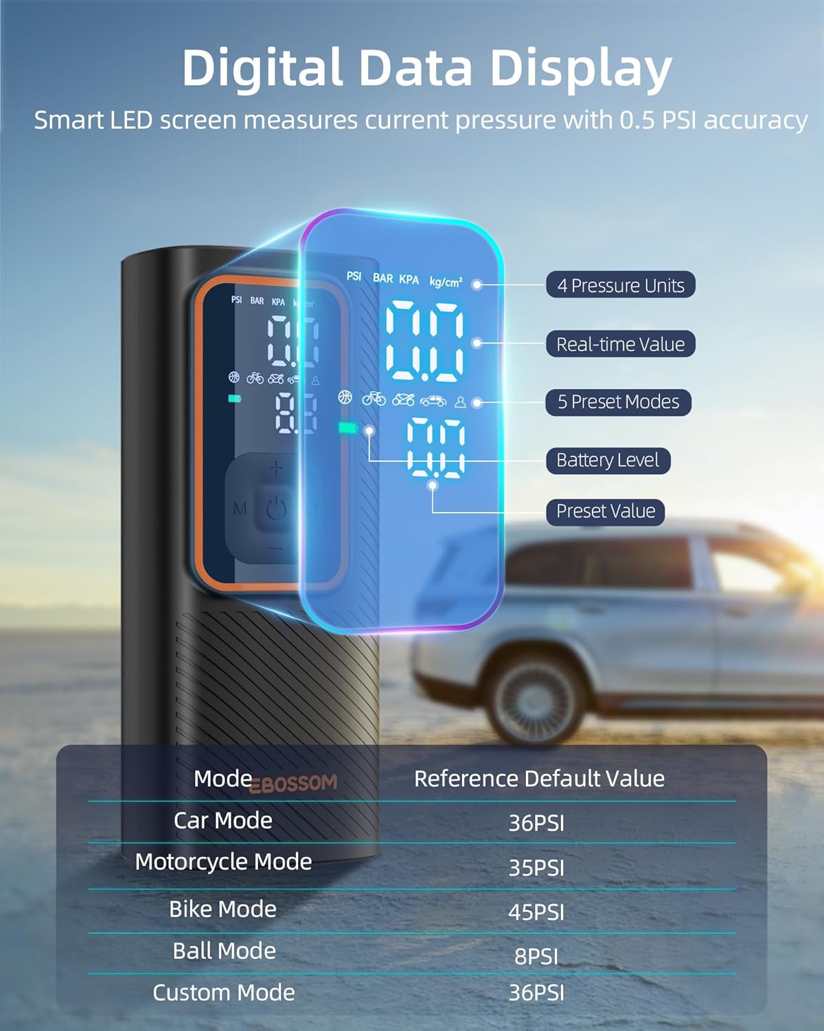 - MULTI-COMPATIBLE: The air pump has 5 preset inflation modes + 4 pressure units. Not only for car and bicycle tires—it's a versatile tool that can handle motorcycle, basketball, and even for small swim ring and air mettress inflation needs