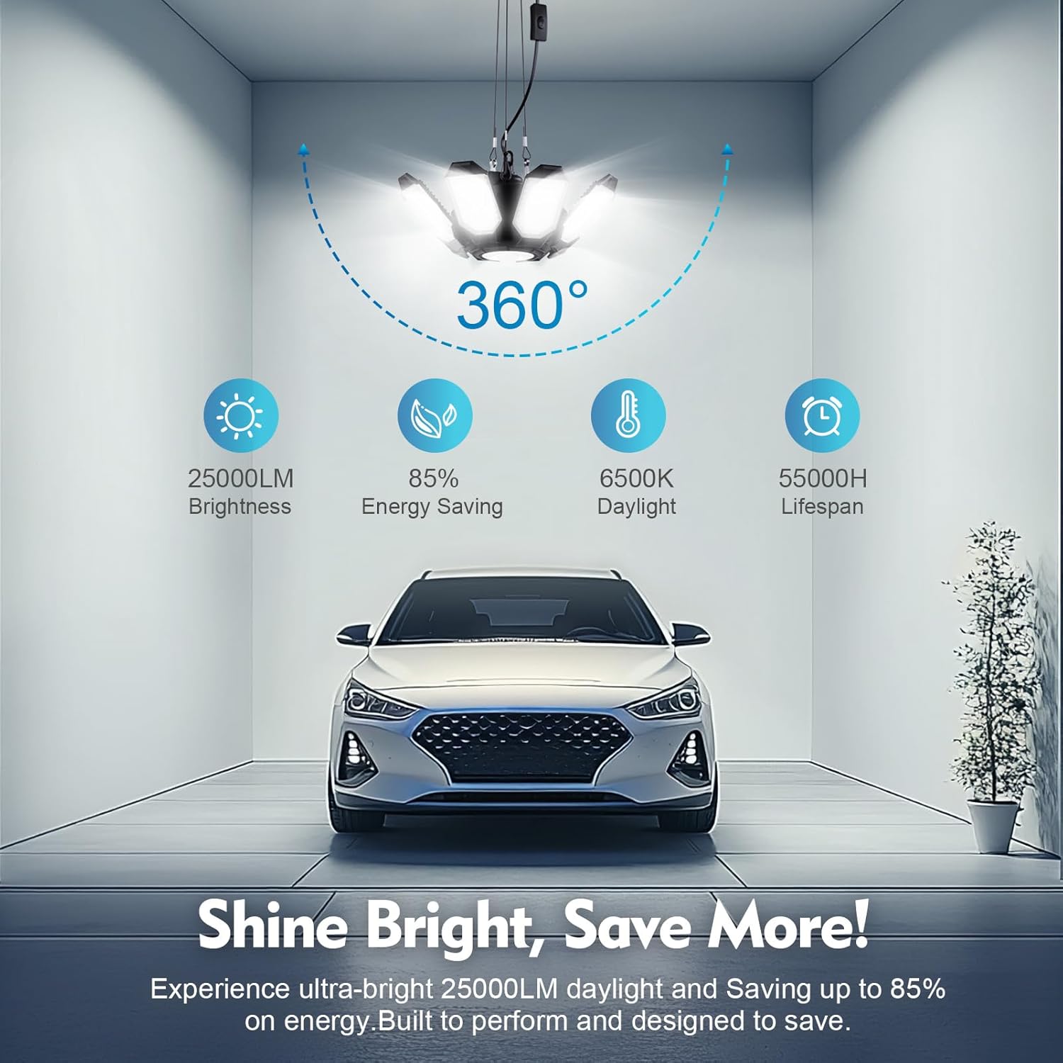 - 【2025 LED Garage Lights Plug in 250W 2 Pack】Tanbaby plug in garage lights (86 to 265v available) use 2025 technology, with 357 high-quality LED chips, two garage lights with a total light output is 50000 lumens at 65000 K "daylight" for your garage, offering no dark areas, flickering or glare, bringing you a more comfortable Visual lighting experience.This is a garage light with motion sensing and infrared sensing.Using this garage light is more intelligent and convenient.