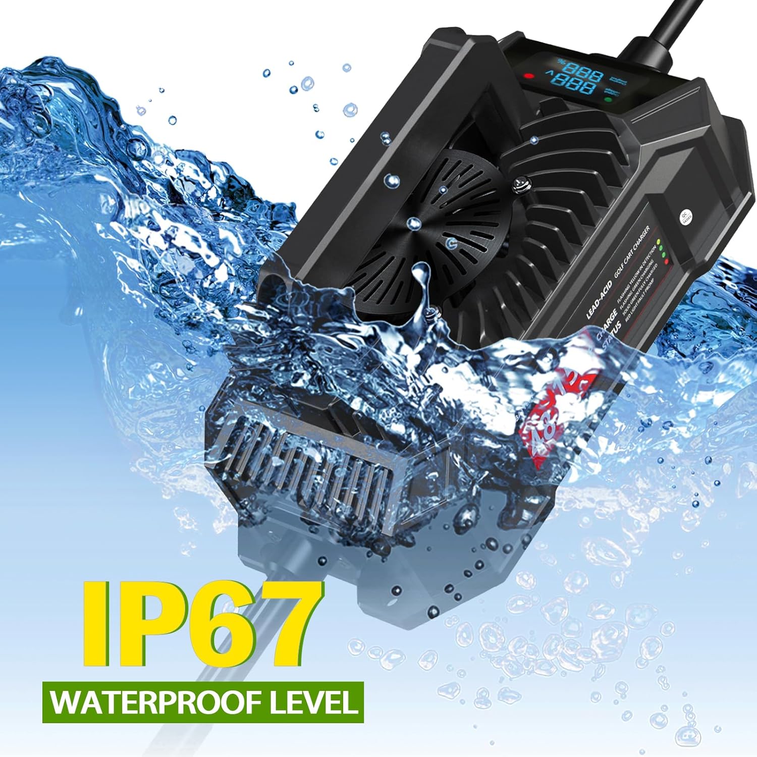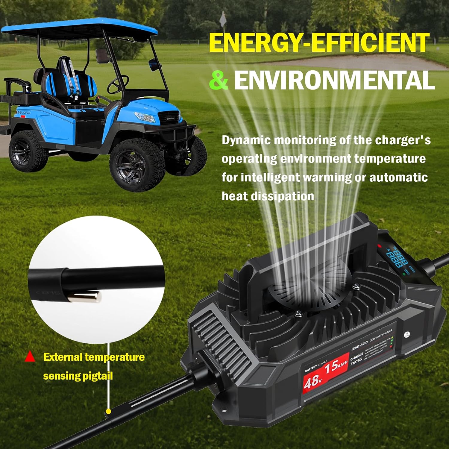 - Energy-efficient and environmental - When the temperature reaches 50ยฐC, the fan will start to run to activate the cooling mode, unlike other brands of chargers, their fan runs constantly when plugged into the golf cart