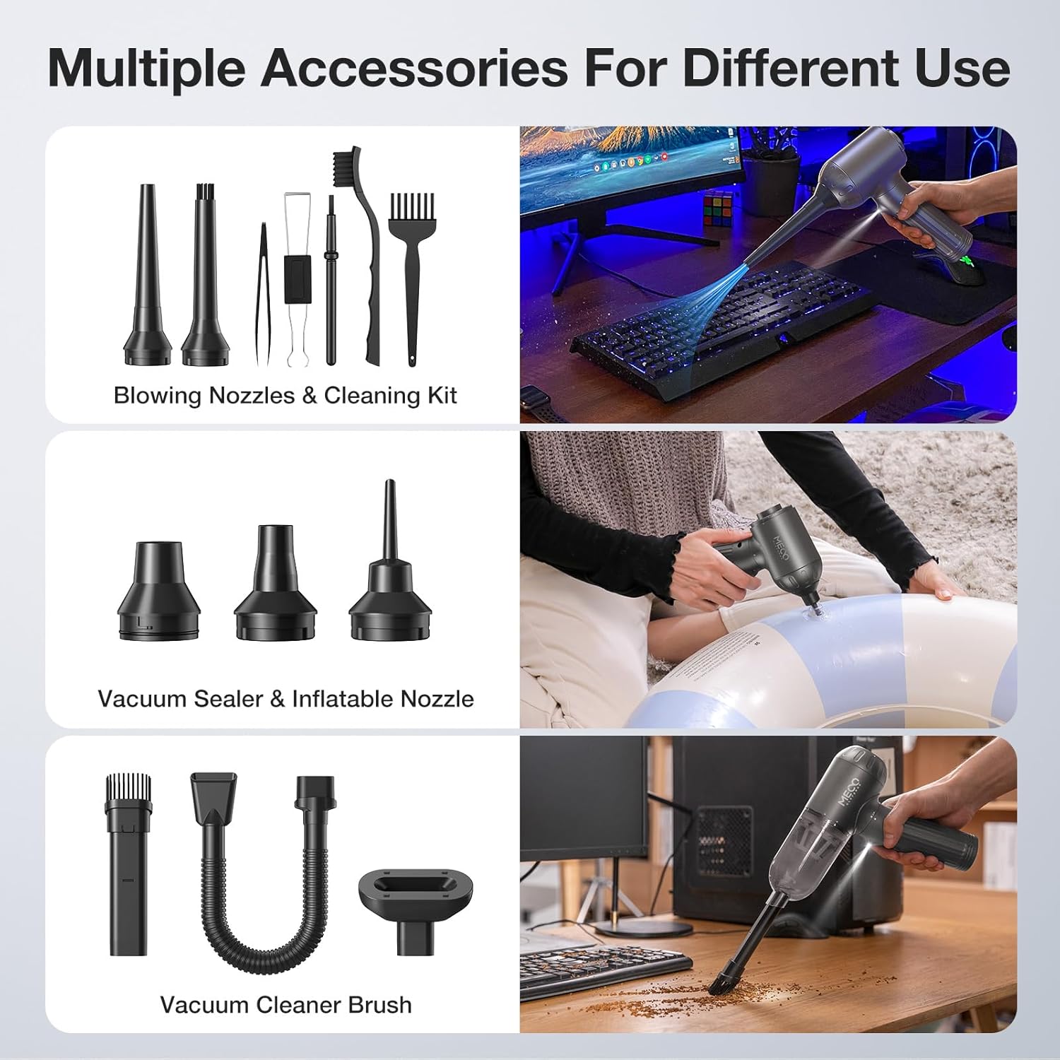 - Brushless Motor & Strong Blowing Power: This 4-in-1 Compressed Air Duster and Mini Vacuum Cleaner is equipped with a powerful 120W brushless motor, strong power for more thorough cleaning. The noise is 20% lower than other vacuum cleaners on the market. Whether it is dust on the computer keyboard, between car seats or ventilation ducts, it can be easily and thoroughly removed