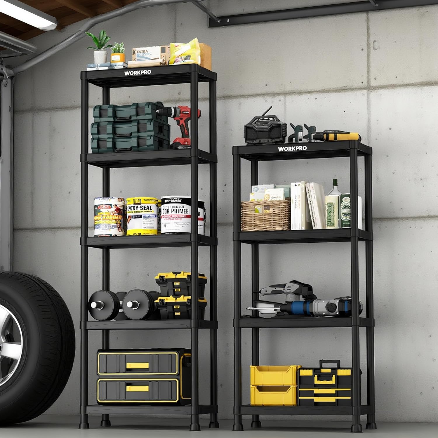 WORKPRO 4-Tier Plastic Storage Shelves, 400lb Capacity Shelving Unit, 51.4" H x 23.9" W x 12" D, Storage Rack for Garage, Home, Pantry, Office, Laundry, Tool-Free Assembly, Black