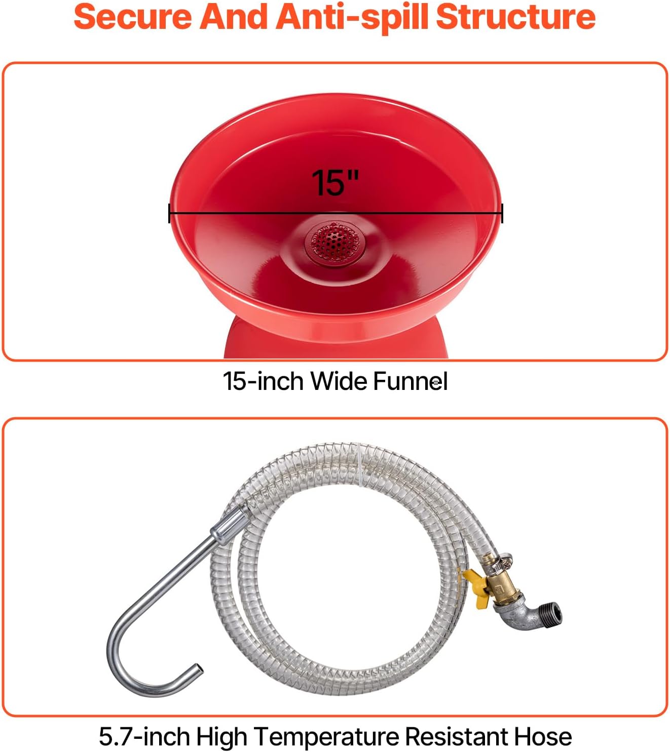 - Anti-leakage Design: Equipped with a 15-inch ultra-wide splash-proof funnel, the oil recovery efficiency is improved simultaneously. Equipped with a 5ft and 9inch high-temperature resistant reinforced oil pipe (withstands 120ยฐC continuous working temperature), it effectively prevents overflow and leakage, ensuring security and reducing the cleaning burden