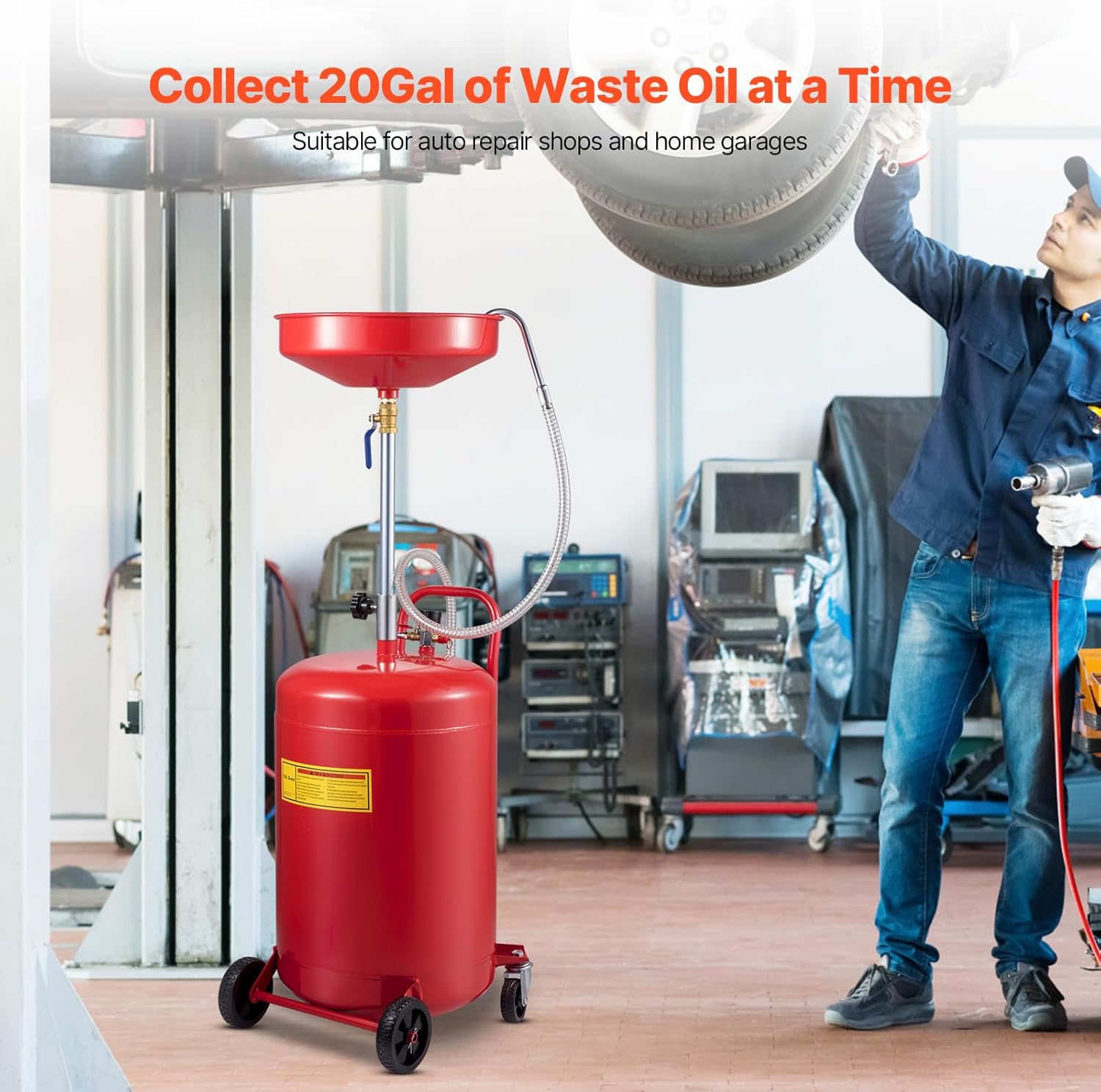 VEVOR 20-Gallon Waste Oil Drain Tank, Air Operated Portable Oil Drainer with Adjustable Funnel Height, Fluid Fuel Transfer Drainage with Wheels, Oil Change Container for Auto Repair Shops, Garages