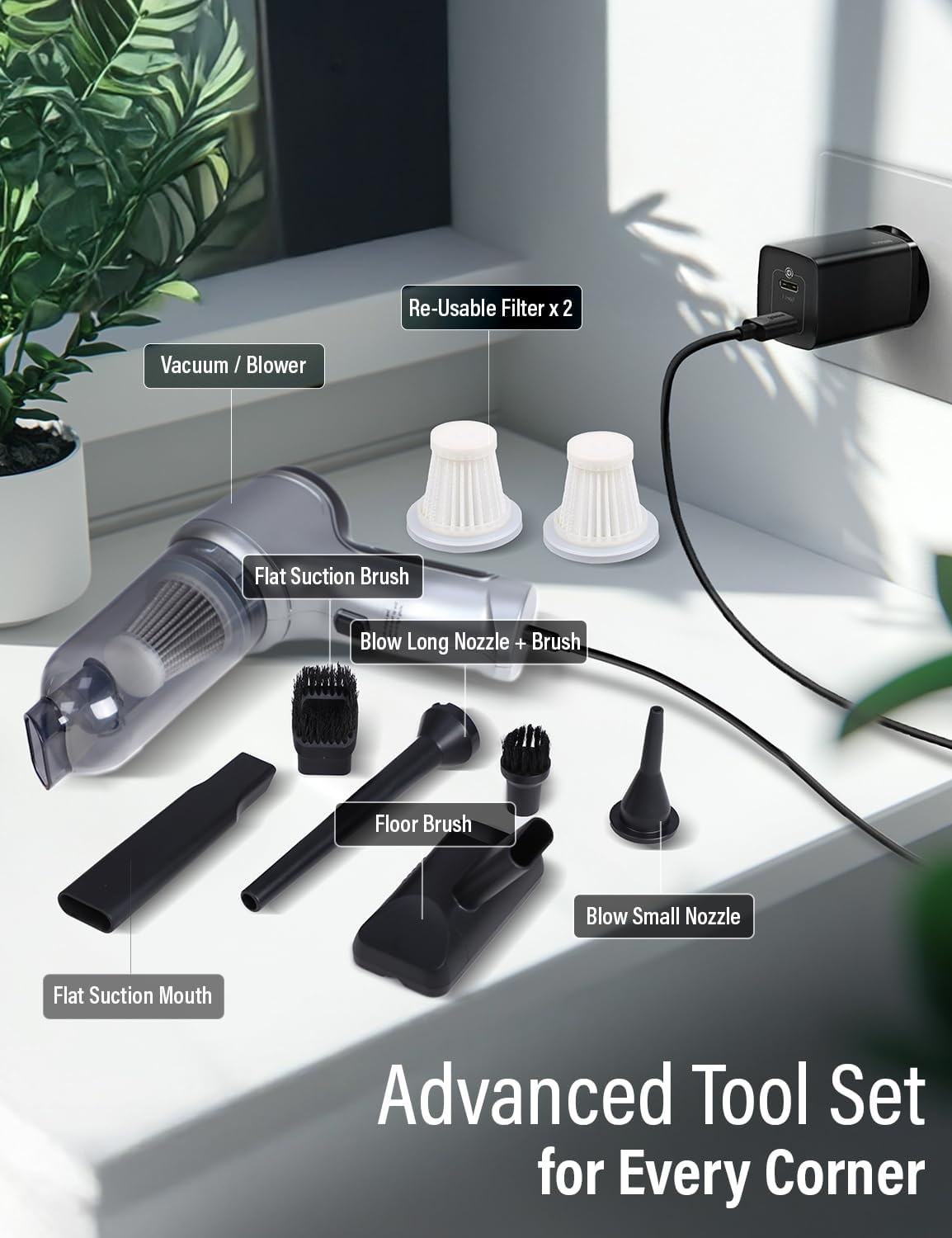 - â Includes Multiple Attachments for Deep Cleaning: Equipped with a flat nozzle, brush tool, extension tube, and dual filter, Our cordless vacuum cleaner for car handles gaps, vents, seats, and even pet hair on furniture.