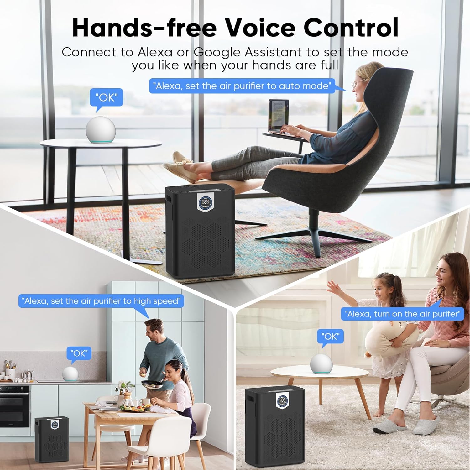 - 【𝐇𝐚𝐧𝐝𝐬-𝐟𝐫𝐞𝐞 𝐯𝐨𝐢𝐜𝐞 𝐜𝐨𝐦𝐦𝐚𝐧𝐝】Hands-free voice command: DAYETTE smart air purifiers for home large room is compatible with Amazon Alexa and Google Assistant for hands-free control. Just give it a voice command and the air purifier will immediately perform the corresponding operation. Super convenient to operate when you leave it or your hands are occupied by housework