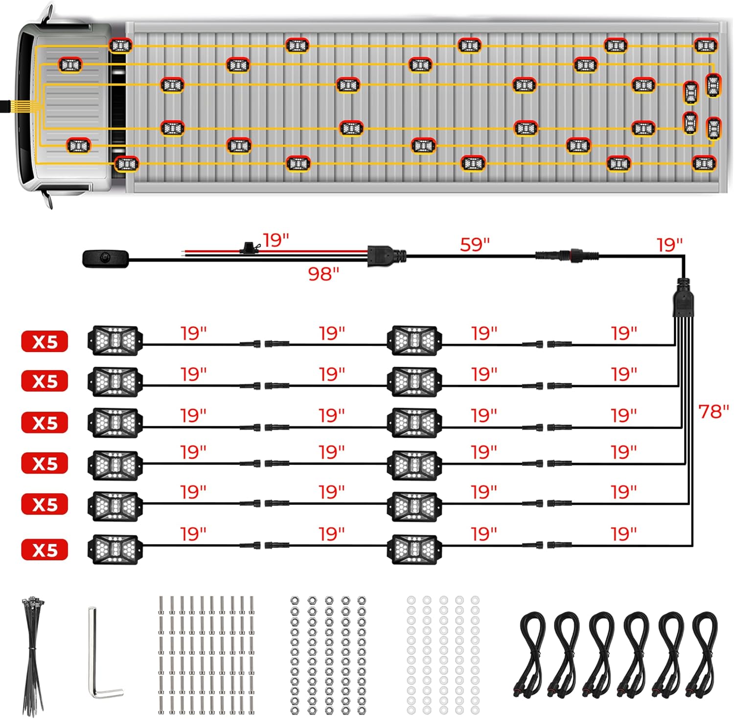 - ăConvenient Wiring Harness ConnectorăOur utv rock lights come with specialized wiring harness connectors (splitters) designed for easy connection to each pod light
