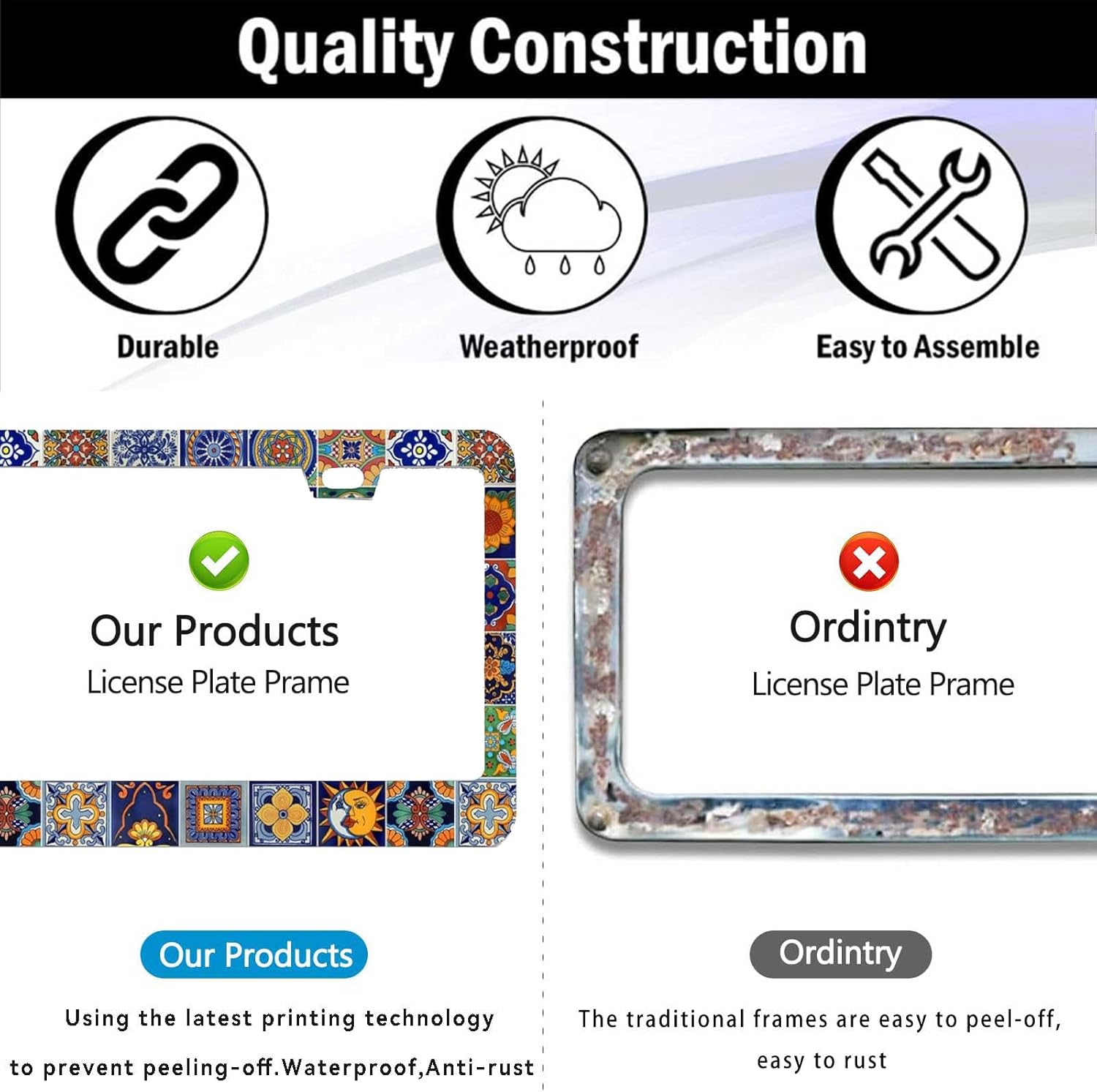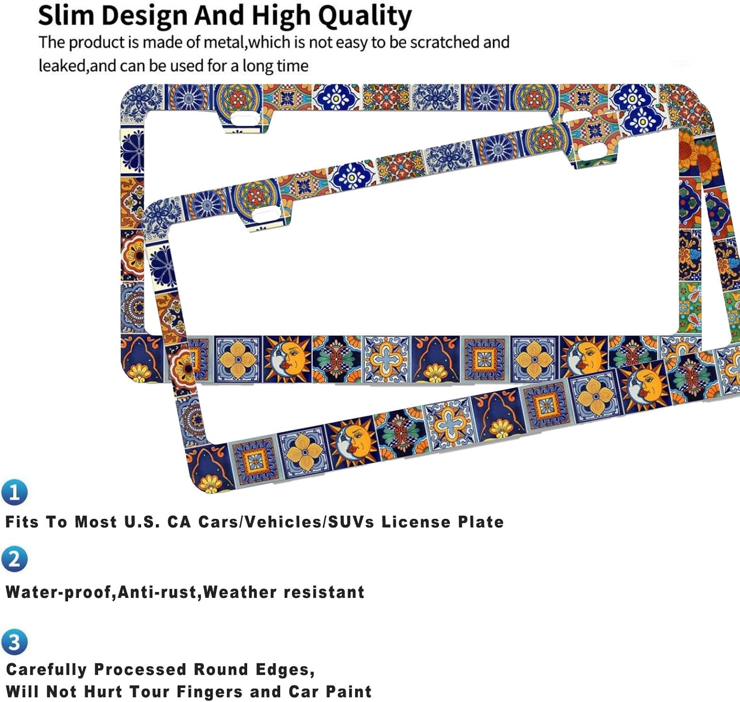 - DURABLE CONSTRUCTION: Made from premium quality metal with weather-resistant coating.Rain or Shine, Stay Secure β Our Rust-Proof Mexican Tiles Boho License Plate Cover Frame Wonβt Budge at Any Speed!