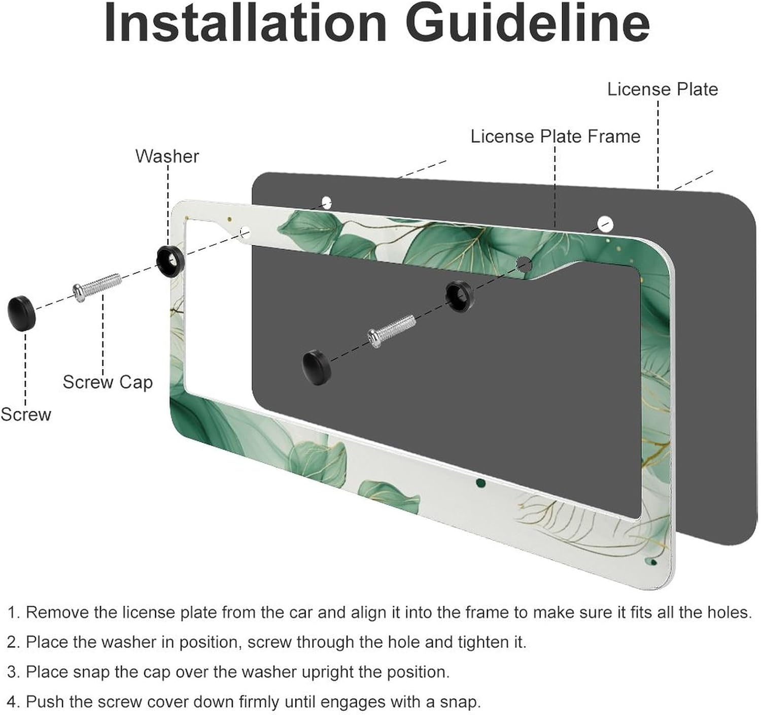 - ▶Quick Installation Design: Simply insert your license plate into the license plate holder and align the plate with the 2 holes on the frame for easy installation. The 2 Pieces aluminum watercolor green palm leaves license plate frames accessories include 4 screw caps, 4 screws, 4 washers.