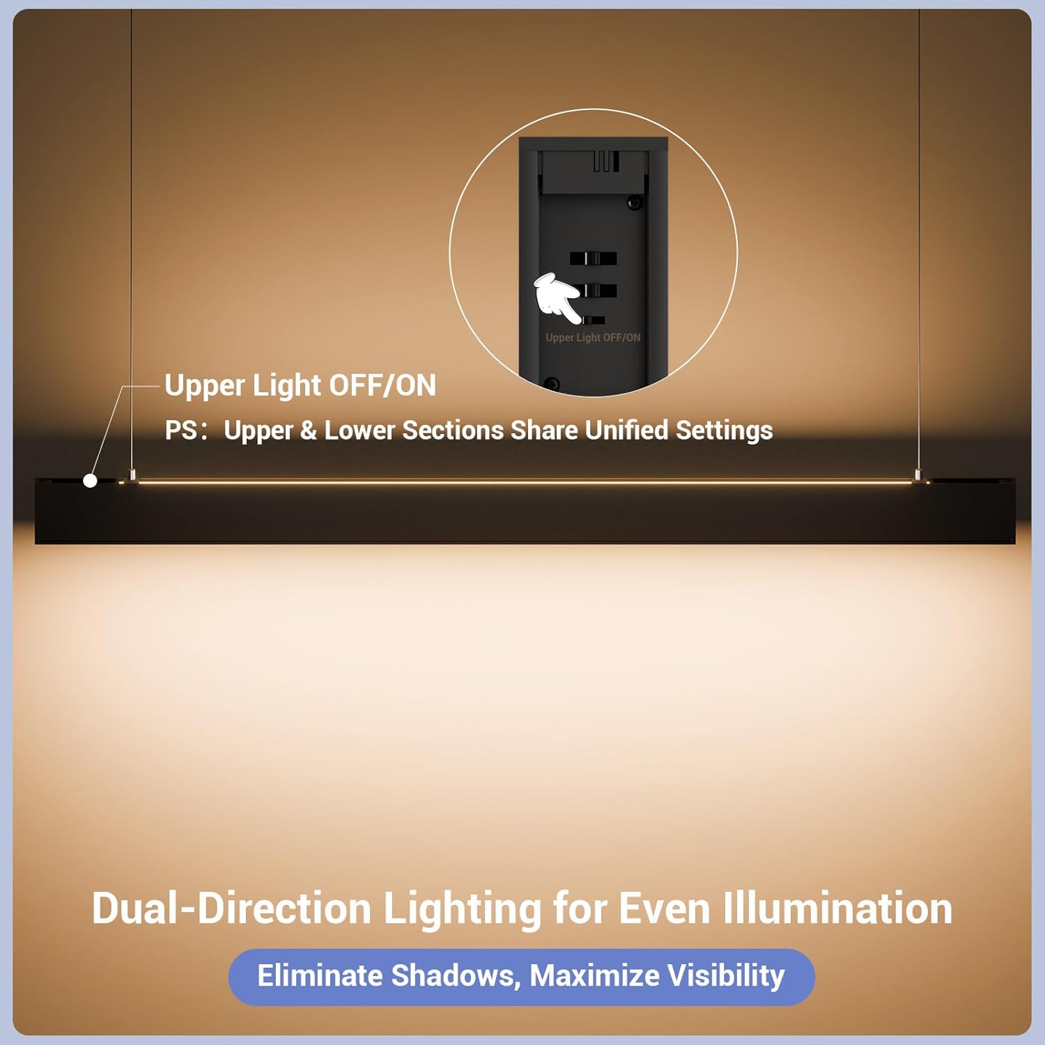 - DIRECT AND INDIRECT LIGHT:LED linear light fixture is innovated with 50/45/40/35/30W down light and 50/45/40/35/30W up light. The down light provides sleek focused lighting and the up light creates a nice ambiance and reduce eye fatigue, perfect for office, work bench, work shop, garage, gym, school, exhibition, bar,and even pool tables.