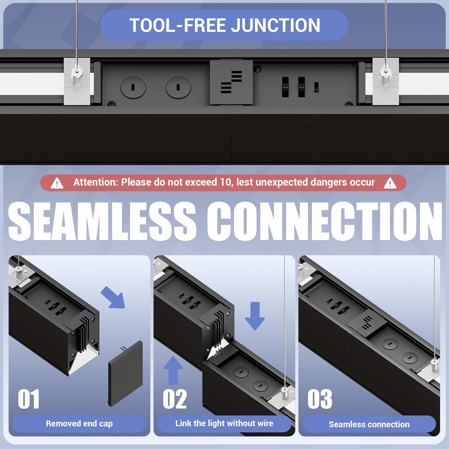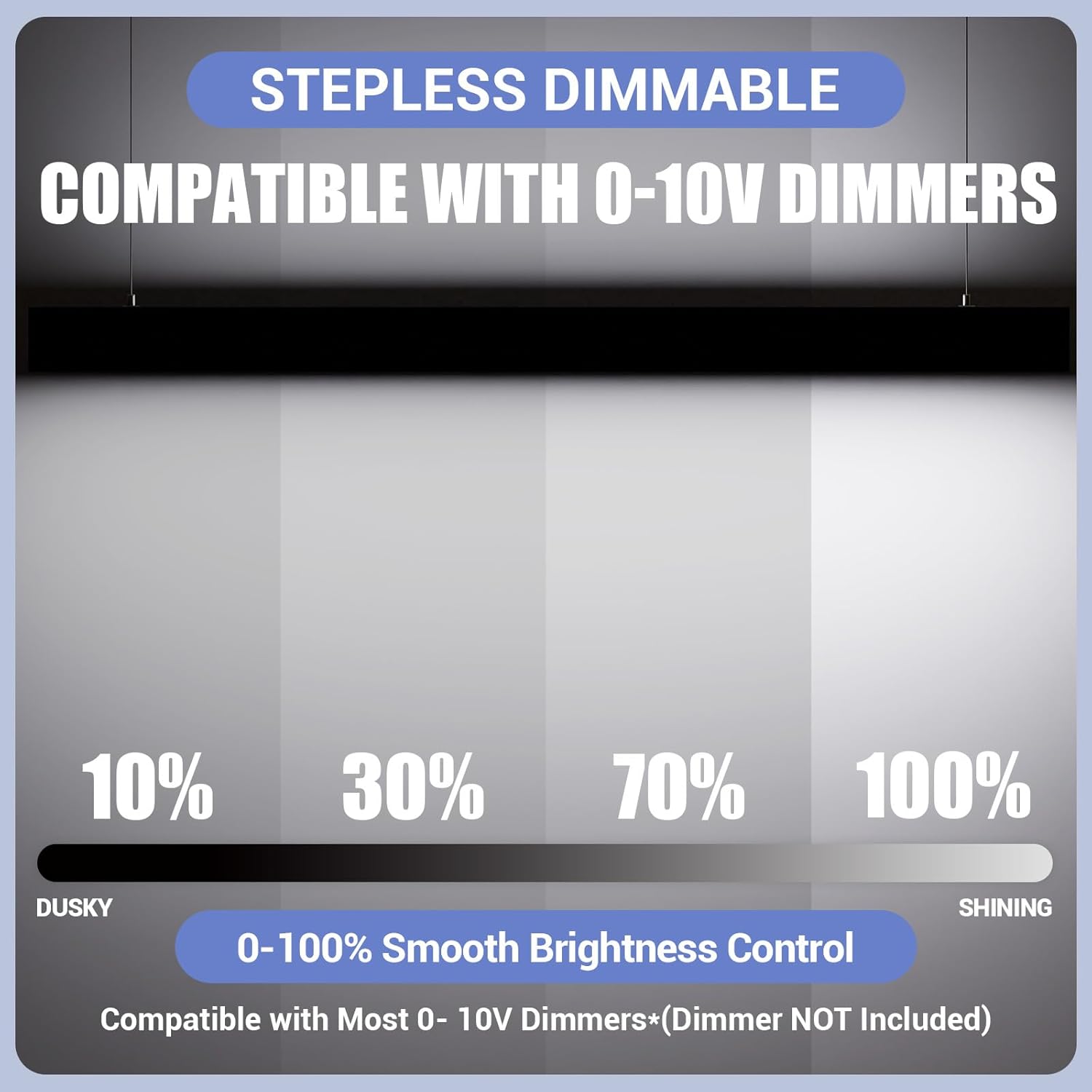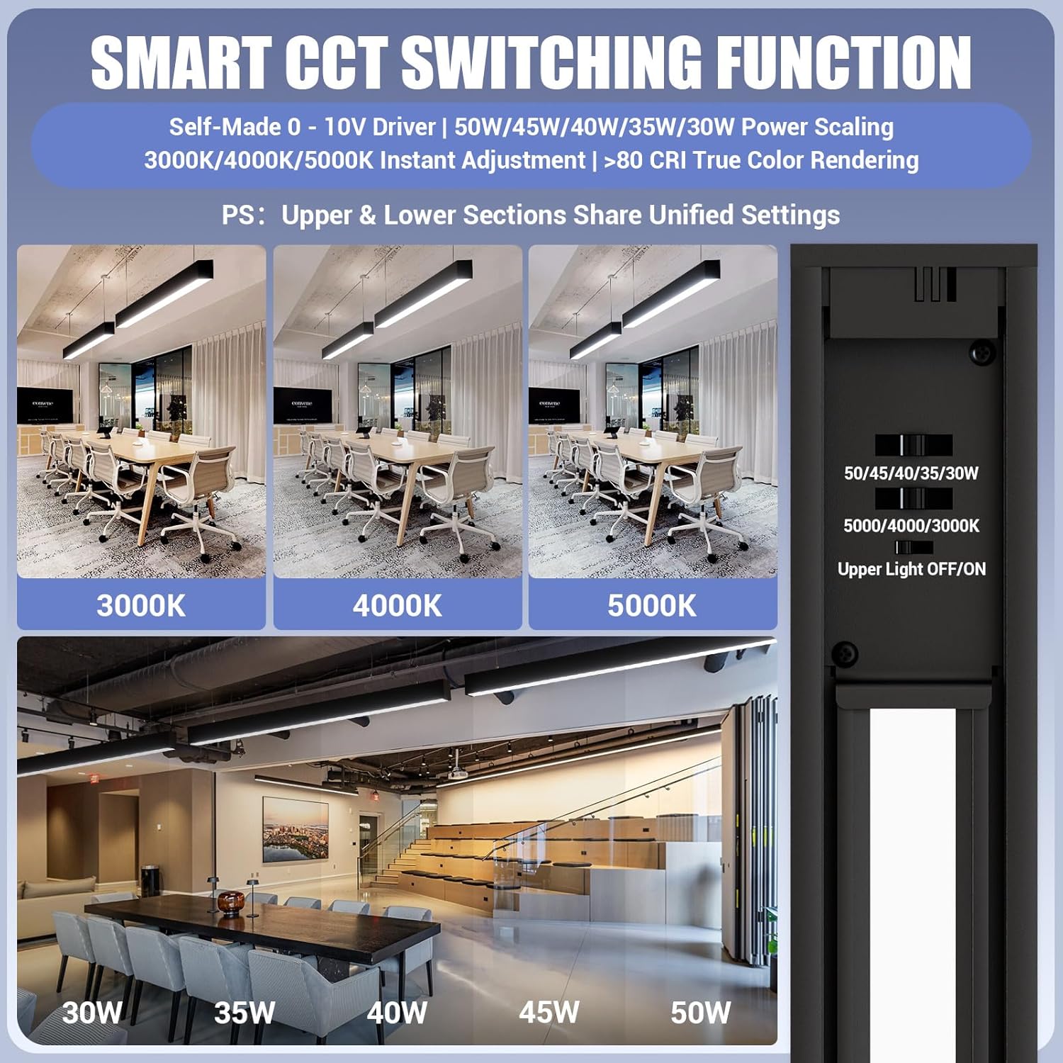 - LINKABLE AND 3000/4000/5000K 3CCT: The suspension linkable led lights can stand individually or in Seamless continuous runs with up to 6 lights, providing clean architectural lighting for your building. Compatible with 0-10V dimmer (not included) to control brightness from 0%-100% without flickering and buzzing.