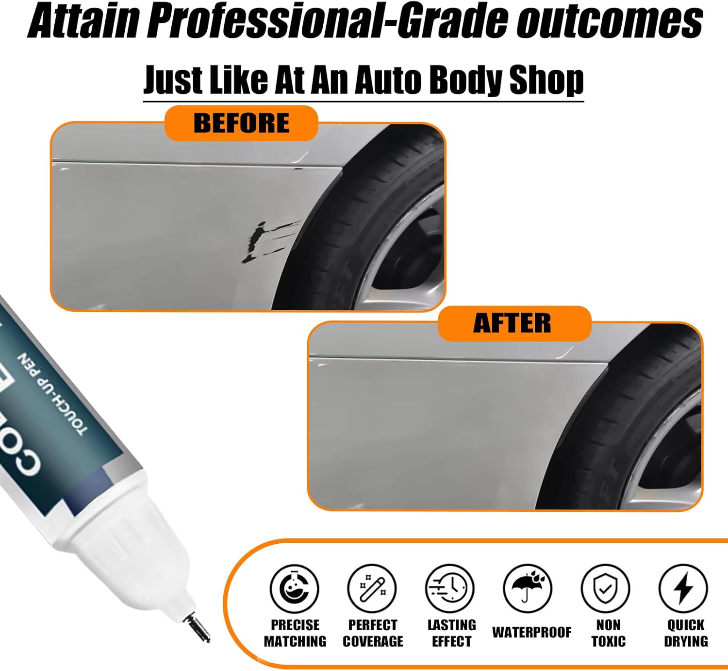 - ăRepair scratches quickly and simplyăThis car scratch repair paint has strong adhesion, anti-rust, and waterproof properties that protect your car's surface from further damage. With a 2-in-1 uses design, each bottle of car paint comes with a pen pin and brush, ensuring a hassle-free application