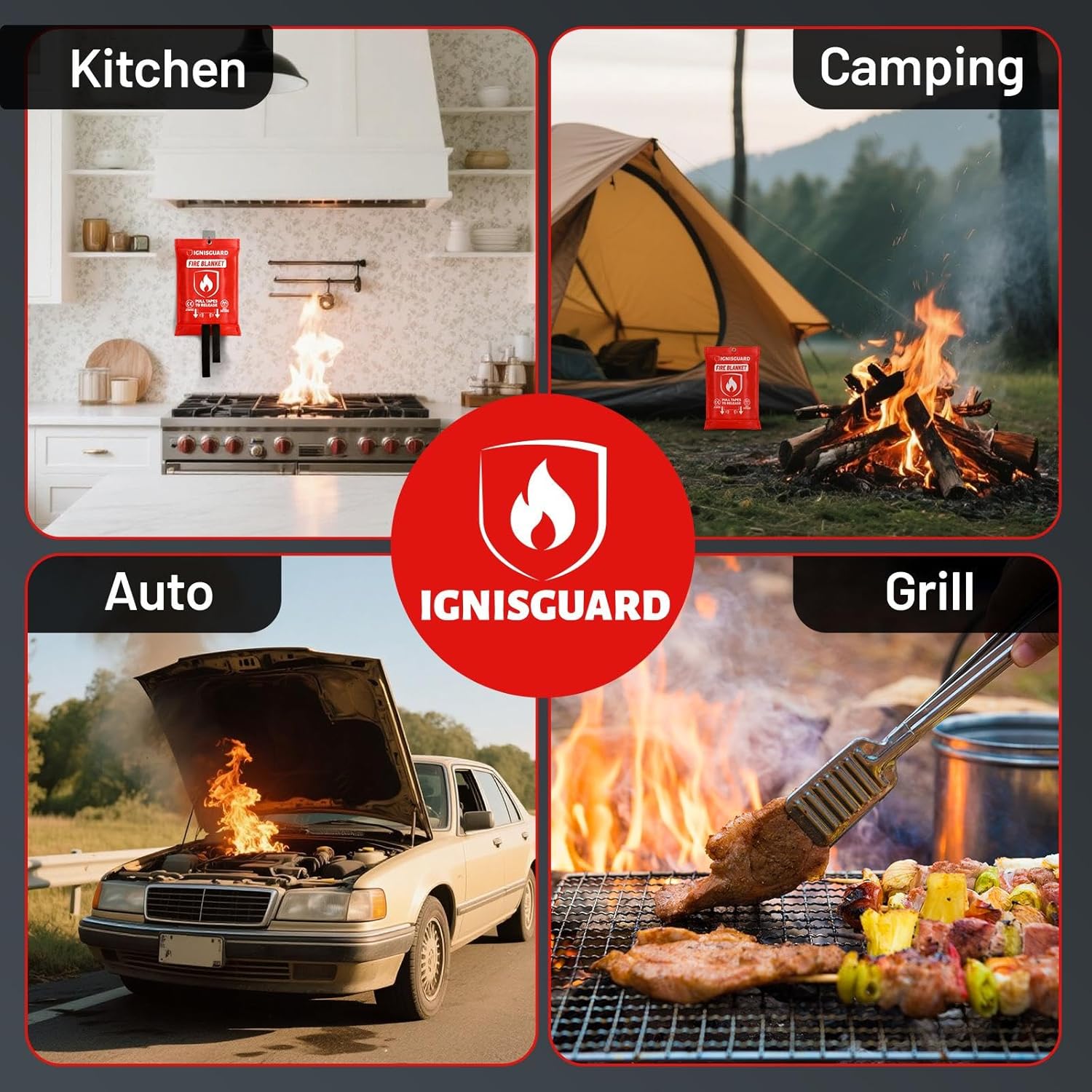 - A Must Have Fire blanket for Home and Kitchen: IGNISGUARD Fiberglass Fire Blankets 2 pack, with A Single 1472°F IGNISGUARD Heat Resistant Glove and 2 Stainless Steel Hooks for hanging. They are essential emergency fire blankets for home safety and are suitable for house, kitchen, BBQ, grill, camping, grilling, backyard, vehicle, restaurant, fireplace, dormitories, etc.
