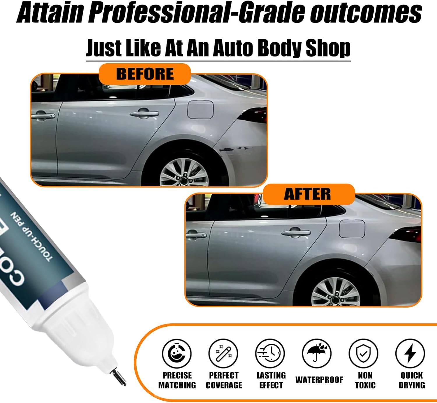 - 【Repair scratches quickly and simply】This car scratch repair paint has strong adhesion, anti-rust, and waterproof properties that protect your car's surface from further damage. With a 2-in-1 uses design, each bottle of car paint comes with a pen pin and brush, ensuring a hassle-free application