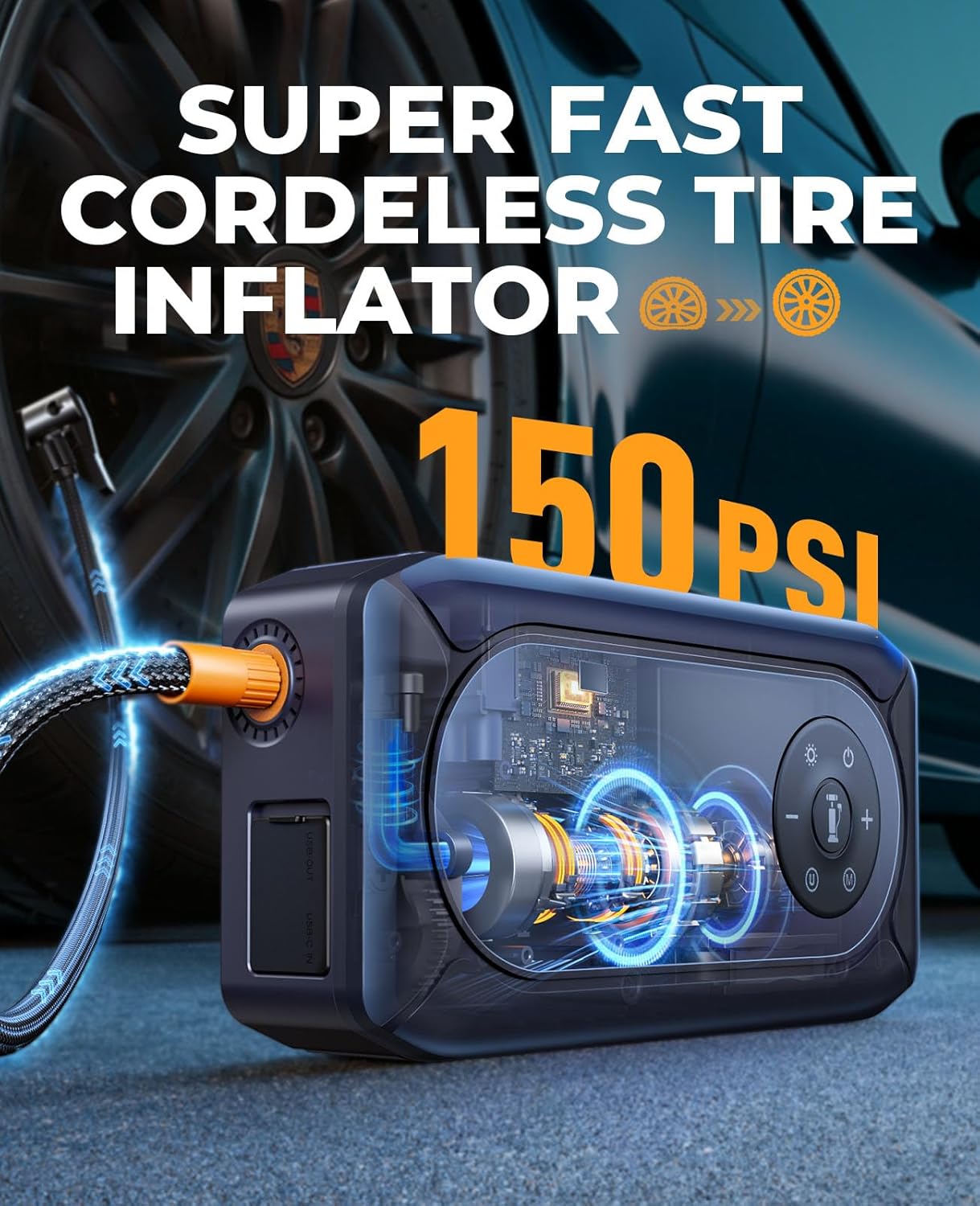 - ➤【5+4+3 150 PSI FAST INFLATOR & 3.3" LCD DISPLAY】 Easy to use, smart preset, pressure detection & auto shut-off. With high turbo 35L/Min (150PSI) lasting 25 minutes, the portable car jump starter with air compressor fills a flat tire to 20 PSI in just 2 mins. 5 inflation modes, 4 different nozzles, 3 optional units and and extended air tubes for wide applications (cars, motorcycle, bikes, balls, etc). Large 3.3-inch screen, viewable in sunlight, reads tire pressure in real time with ±1 PSI accuracy.