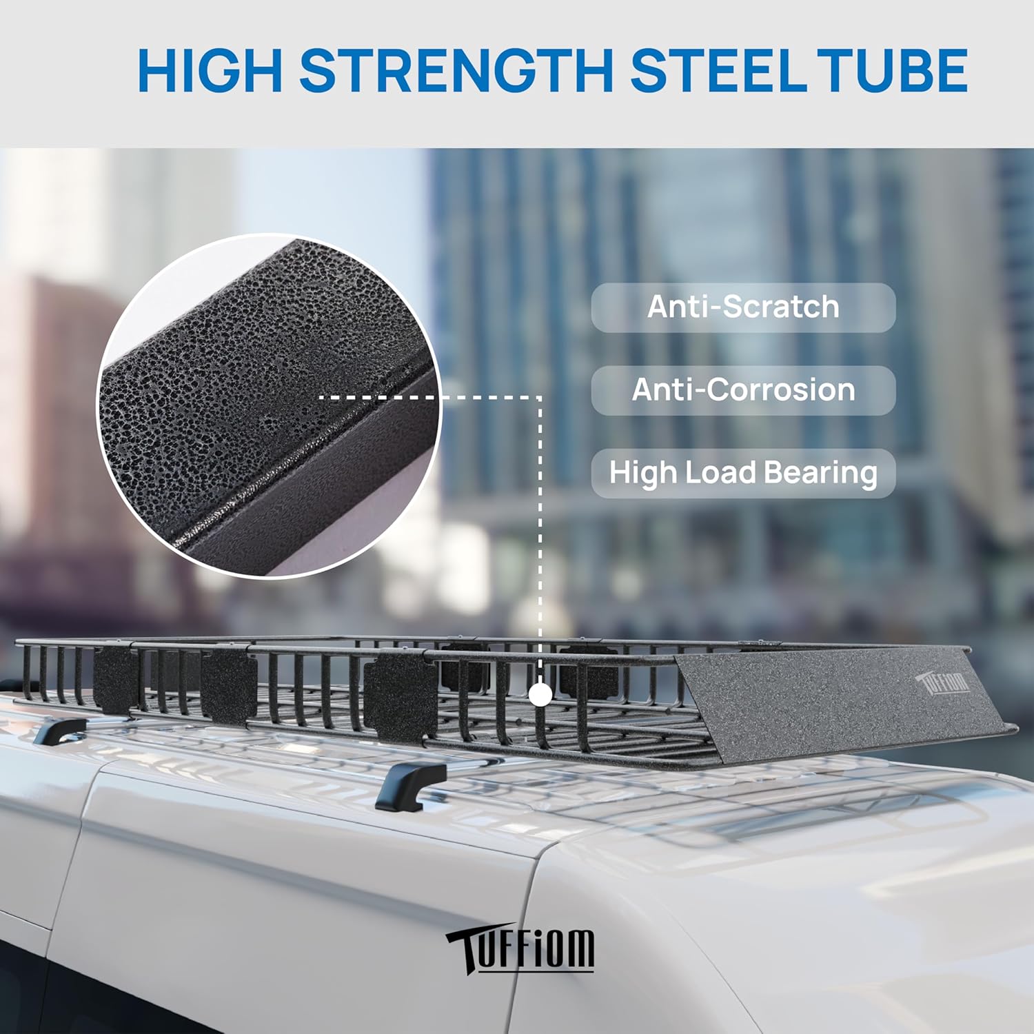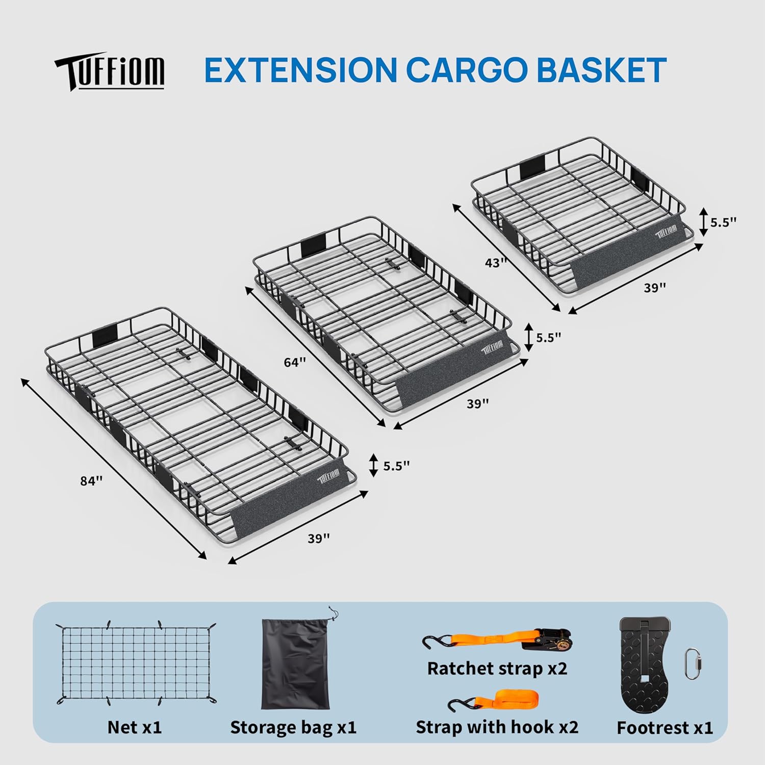 TUFFIOM 84"x 39"x 6" Universal Rooftop Cargo Carrier Basket, Extendable Steel Roof Rack Basket w/Net+Storage Bag+Pedal+Straps, Heavy Duty Car Top Rack Luggage Holder Carrier for SUV Car Truck Van