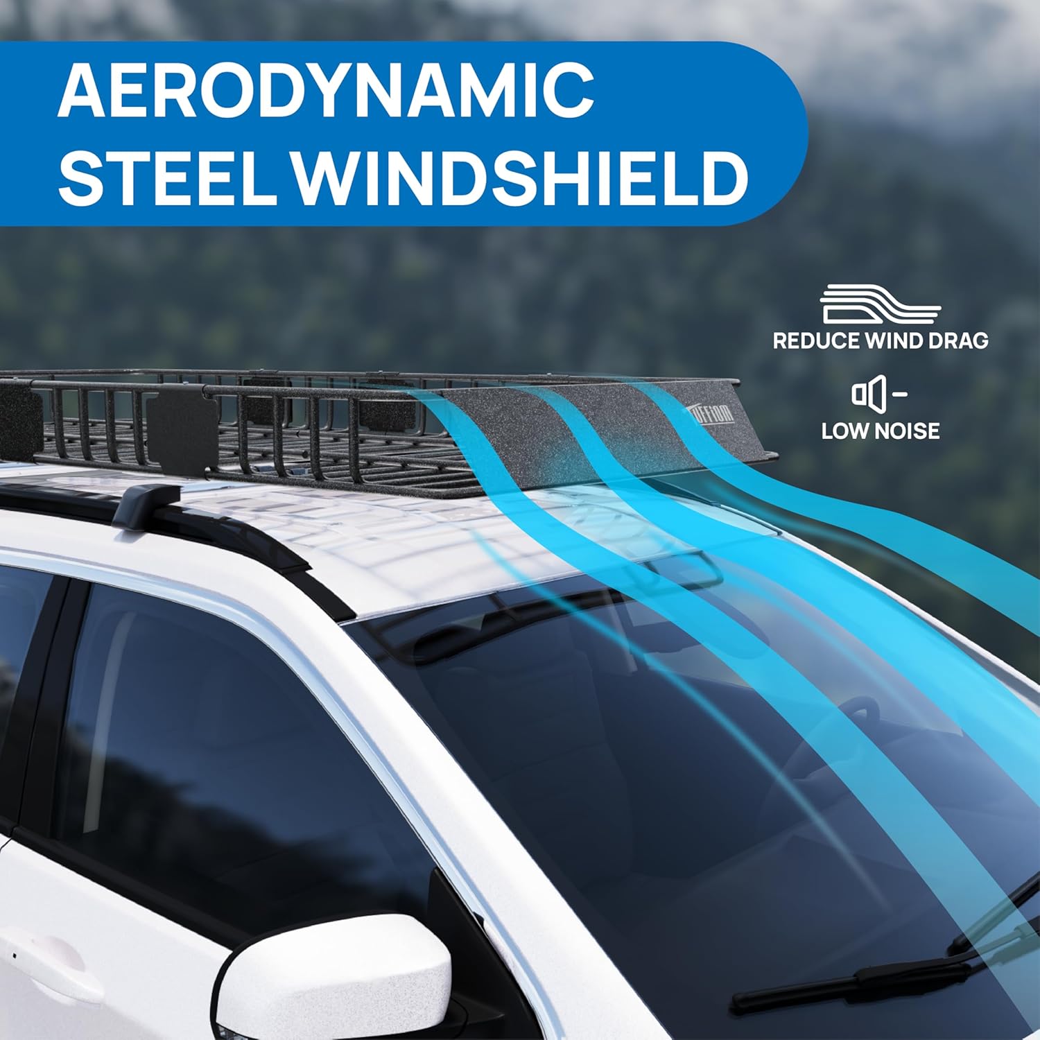 - 【Safe & Convenient Design】Features a wind shield forward protect cargo from wind damage and reducing wind resistance. With a footrest, it is more convenient for you to store or take the luggage on the roof.