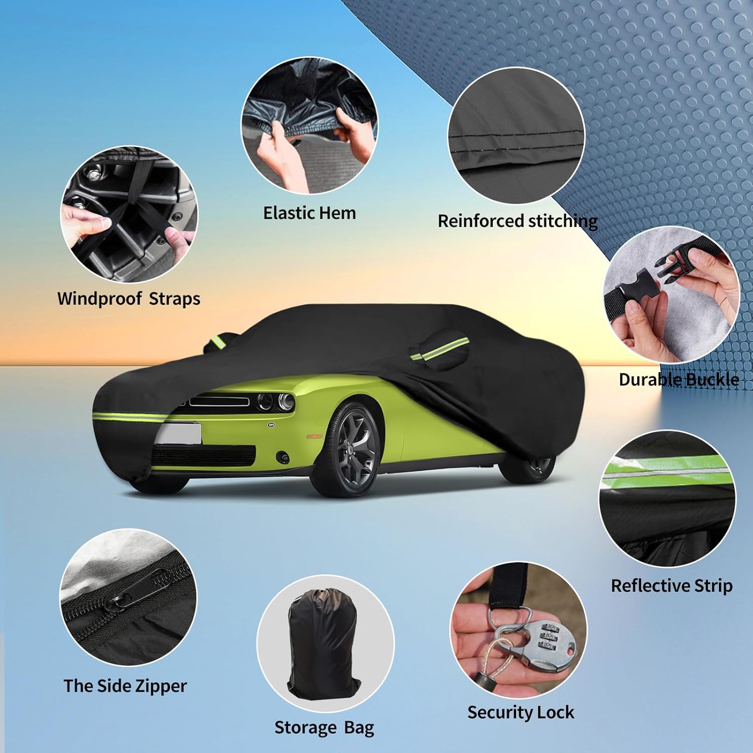 - ăDriver Side Zipper DesignăOur car cover features a convenient driver's side zipper design for easy access. Additionally, it is equipped with night reflective strips on the surface for increased visibility at night, helping to prevent accidents. Mirror pockets are included to protect your mirrors from damage. Windproof straps ensure that the car cover remains secure even in windy conditions. It also comes with a combination lock to keep your cover securely fastened under your vehicle.