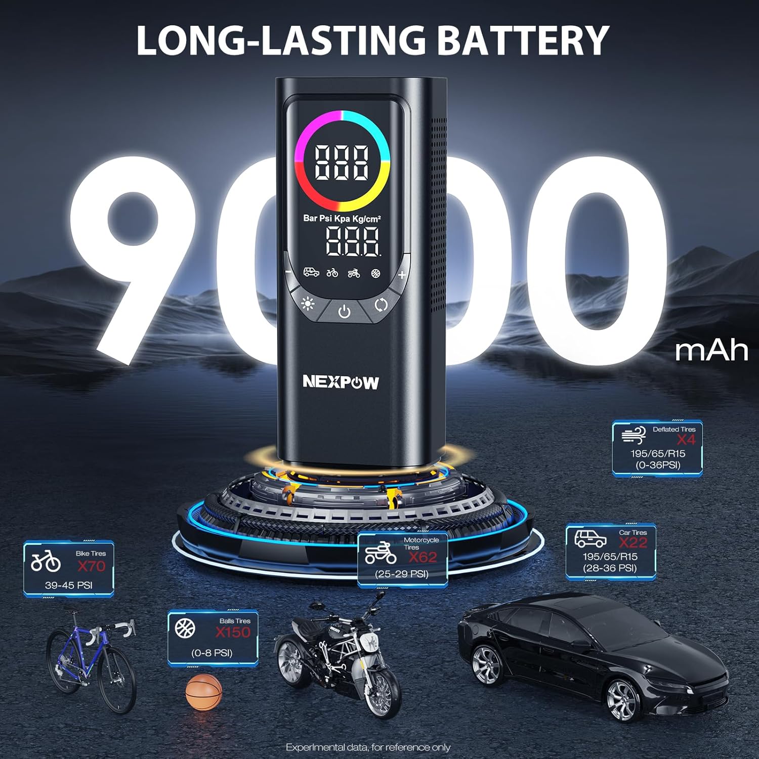 - 4X FASTER INFLATION: NEXPOW portable air pump is born with a powerful motor and a high-performance chip, providing a maximum pressure of 150PSI and a strong airflow. This portable tire inflator for cars can pump up a standard car tire from 30 to 36PSI in less than 1 minute, offering 4X faster inflation than others. It can save you valuable time in emergencies or routine maintenance.