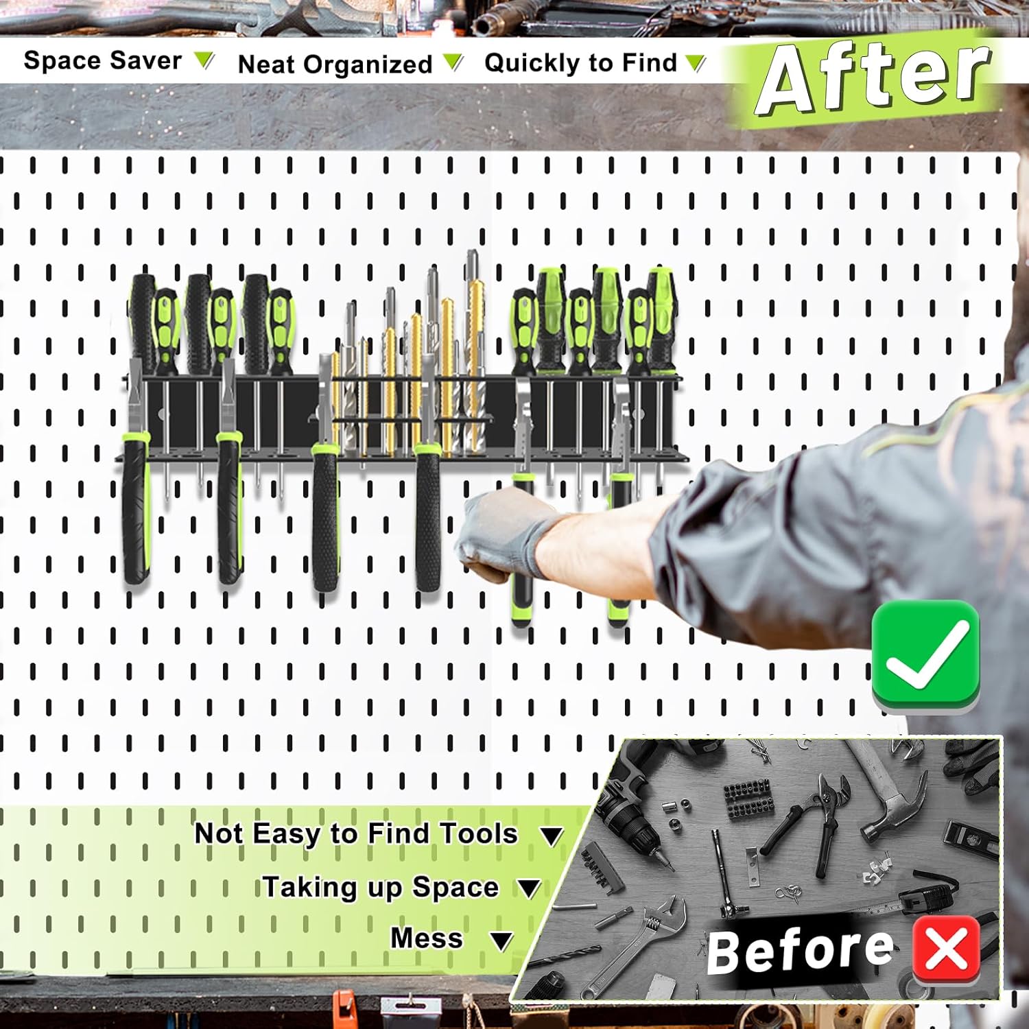 - Quick Access To Tools: This tool rack neatly organizes screwdrivers, pliers, and drill bits for easy access at a glance