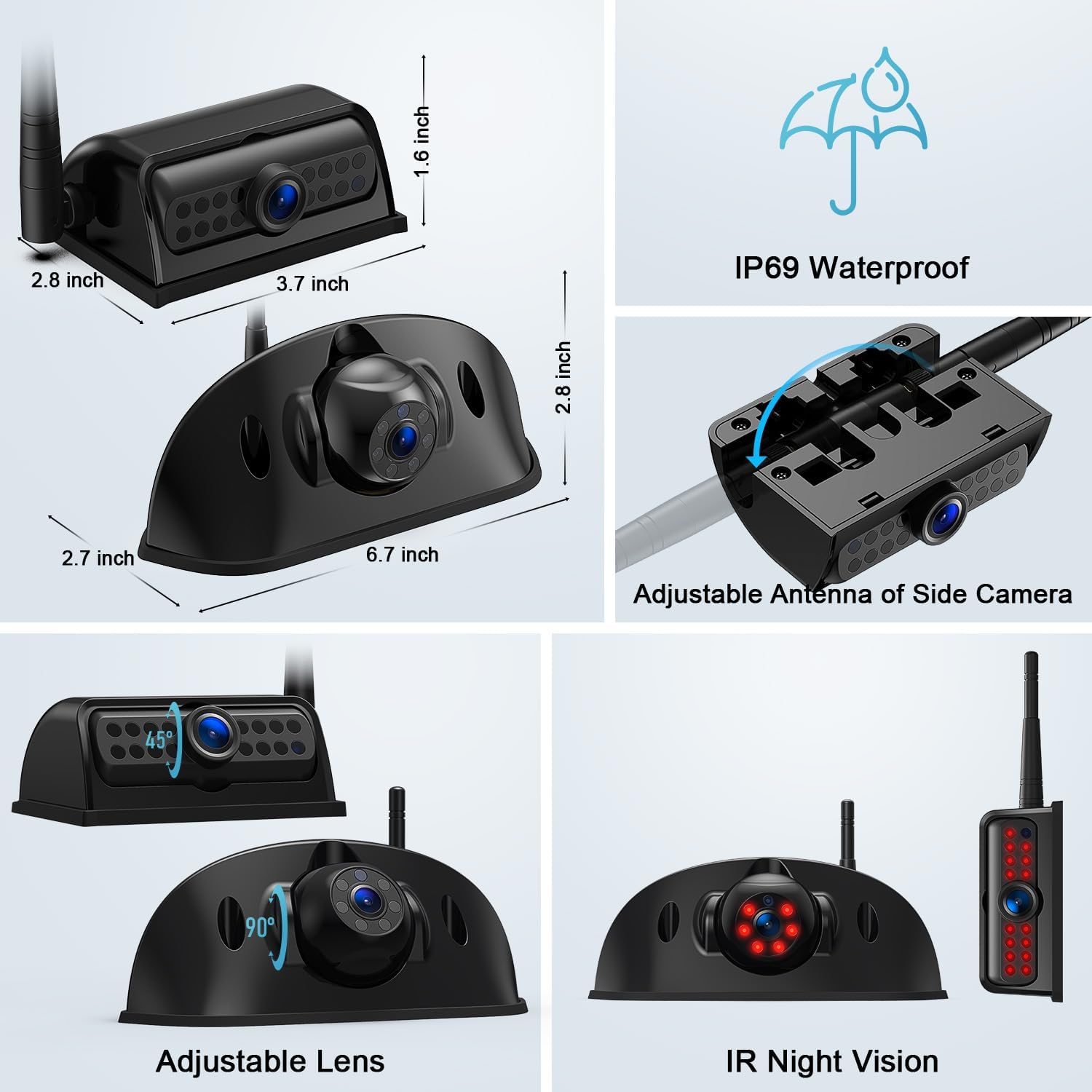 - IP69 Waterproof Side View Camera with Night Vision: The HD side camera with IP69 waterproof and 120-degree viewing angle brings you the best view and longer product life. Equipped with 15 IR lights and a photoreceptor, the lights automatically turn on when the ambient light is low. Not fixed as a left-view or right-view camera, you can adjust the orientation of the screen image or re-pair it. The antenna is adjustable to face up or down as needed and has the option of being up or folded down.