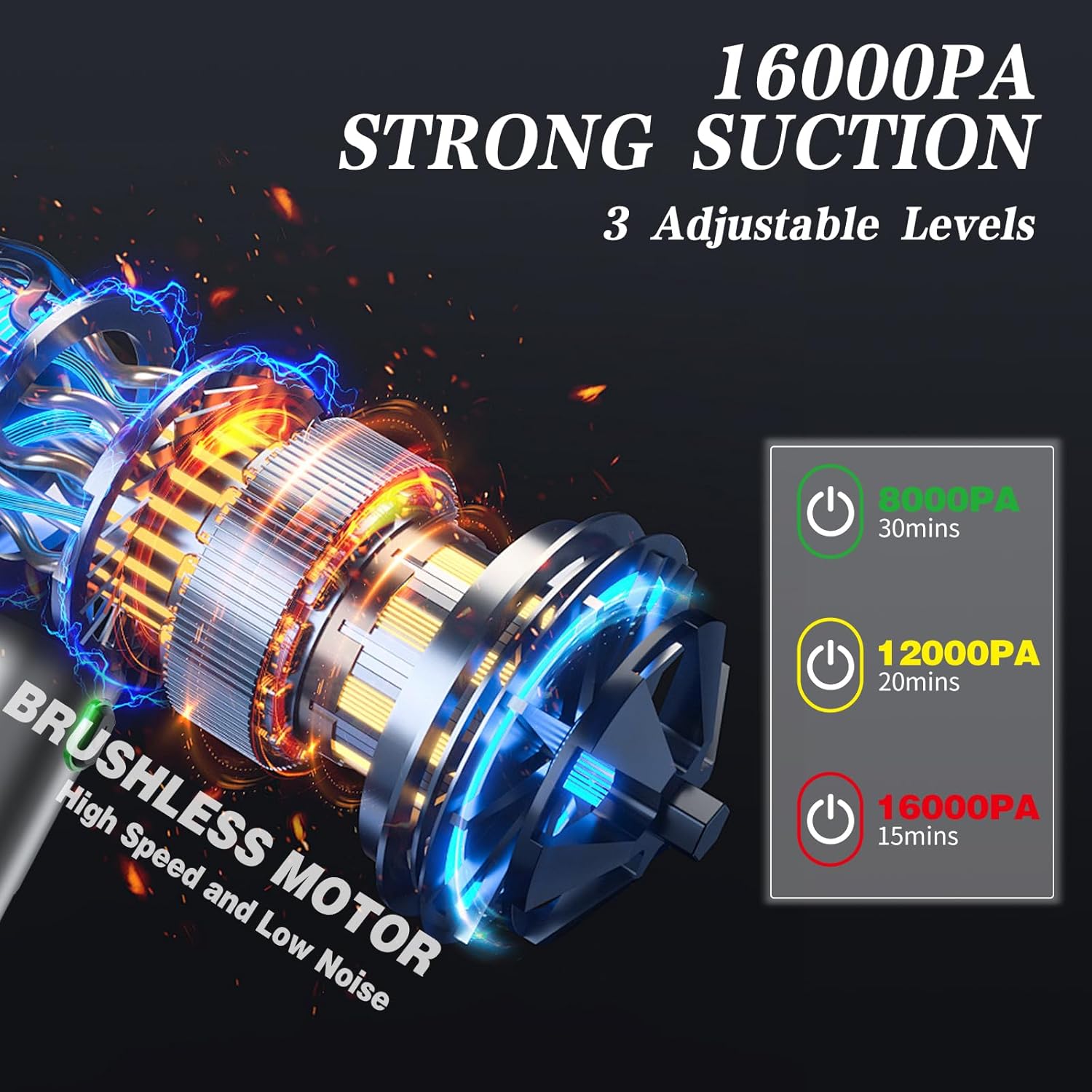 - 16000Pa Ultra-Powerful Suction & Brushless Motor :cordless car vacuum cleaner delivers 16000Pa industrial-grade suction powered by a high-efficiency brushless motor, effortlessly removing pet hair, dust, crumbs and debris from car seats, carpets and upholstery. The advanced motor design of the handheld vacuum cordless ensures quiet operation and long lifespan.