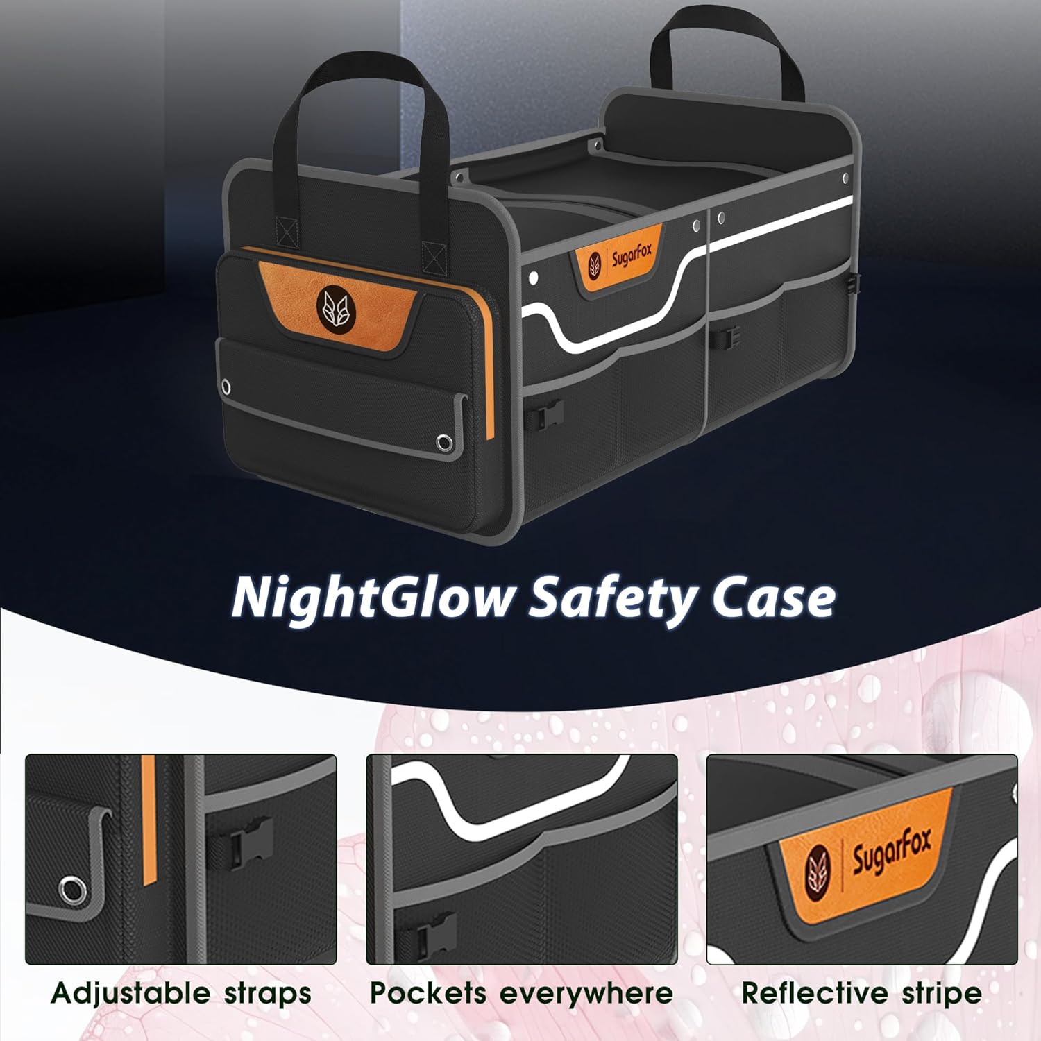 - Safety Features:Featuring 360° reflective strips, this SUV trunk organizer maximizes visibility in low-light conditions, alerting nearby vehicles during dusk or rainy drives. Reinforced with military-grade metal buckles, the trunk organizer for car withstands sudden stops and rough terrain, locking items securely for enhanced driving safety.