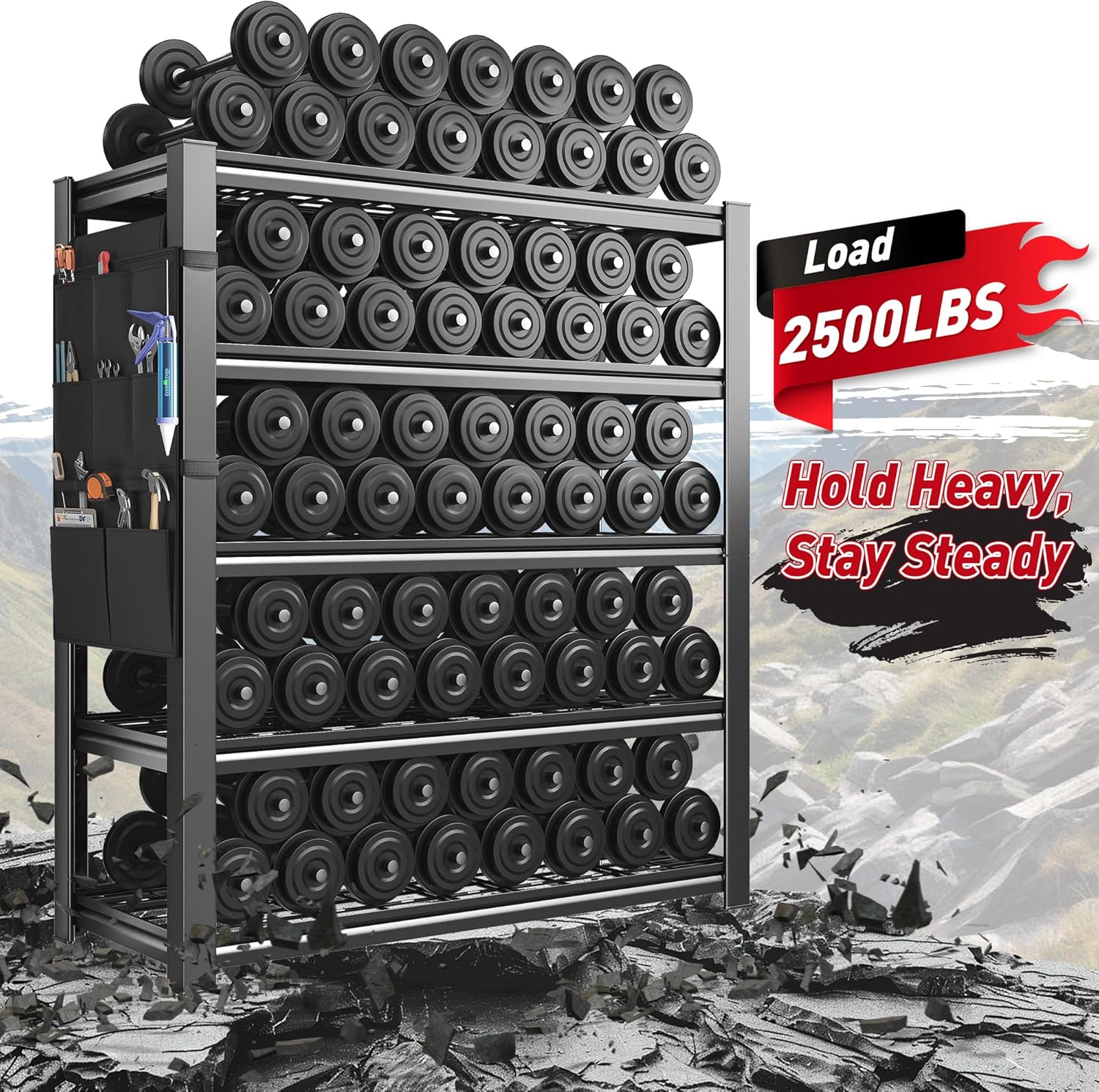 - 【2500LBS Heavy-Duty Garage Shelving】This garage shelving unit features double-walled steel columns for enhanced durability, supporting up to 500 LBS per shelf (2500 LBS total capacity). You can safely store bulky tools, auto parts, or holiday decorations with no risk of bending or collapse