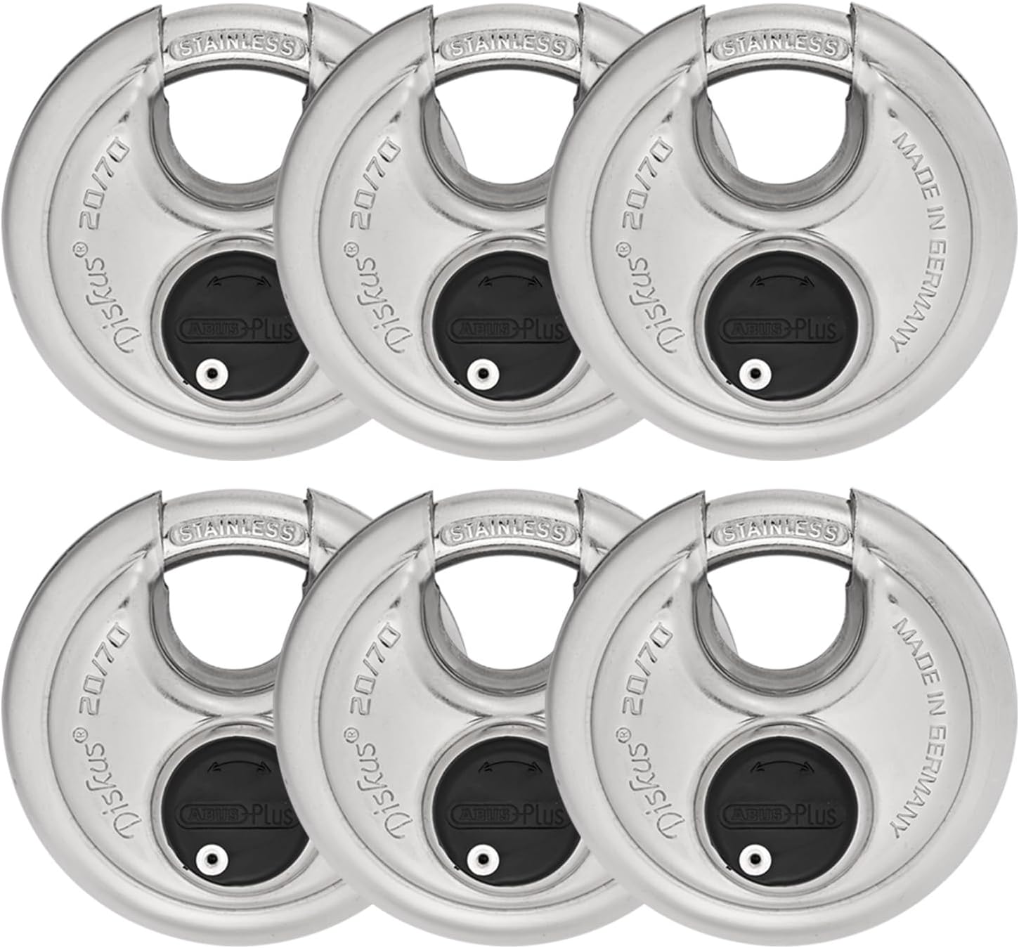 6 Pack ABUS Diskus 20/70 Heavy Duty Stainless Steel Disk Padlock - Rustproof Storage Lock with 3/8" Shackle - Made in Germany - Keyed Alike Code 323614