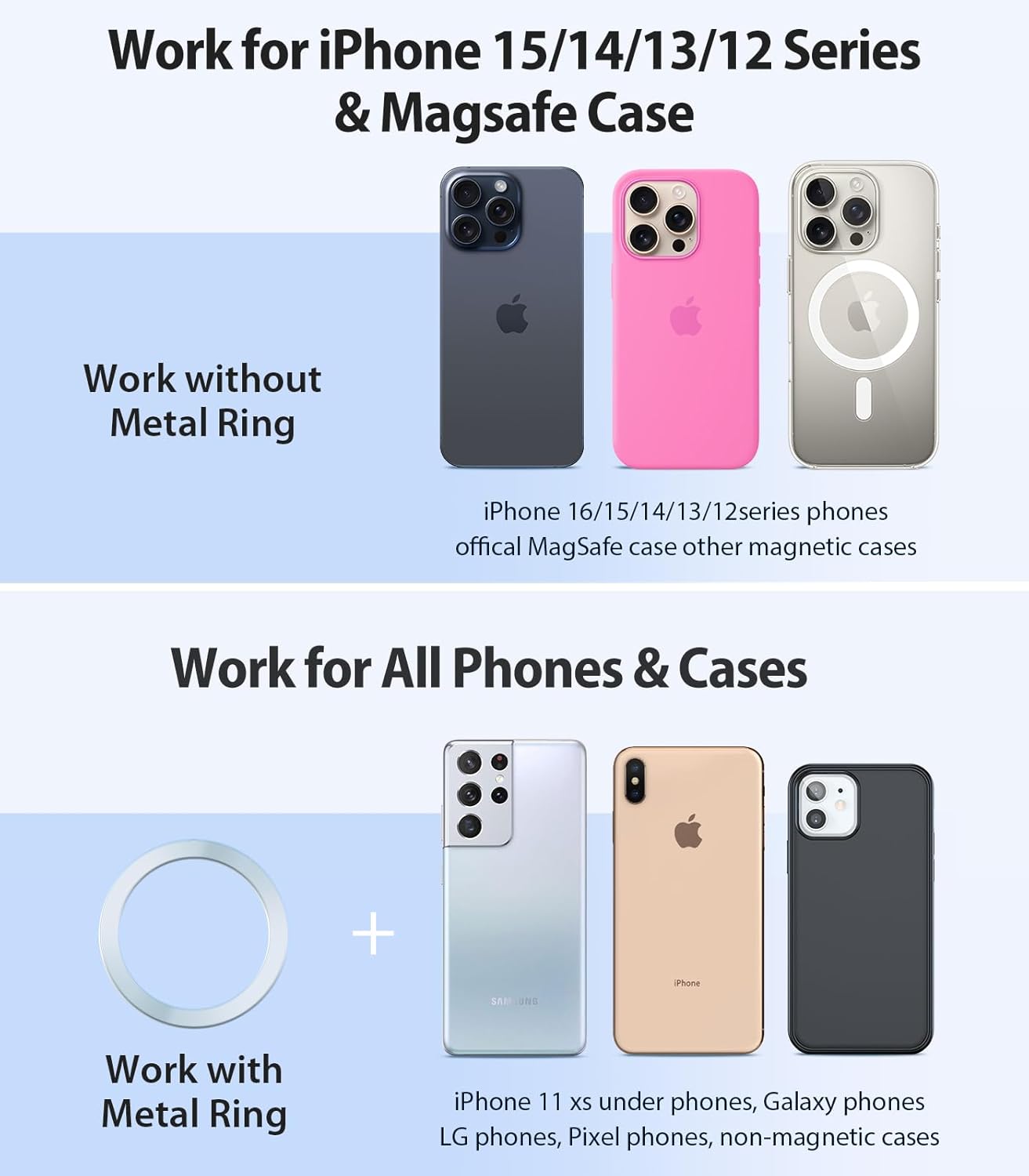 - [Work for All Phones] This magnetic car phone holder works for all phones & cases. We provide extra 2 metal rings on this magnetic phone holder for car. Stick the metal ring on the phone or case. The super magnet power of the phone magnet for car holds your phone absolutely still and steadily even on the bumpiest road or cobblestone street. Surprisingly, the hollowed-out ring design of this magnet cell phone holder for car won’t block the wireless charging function