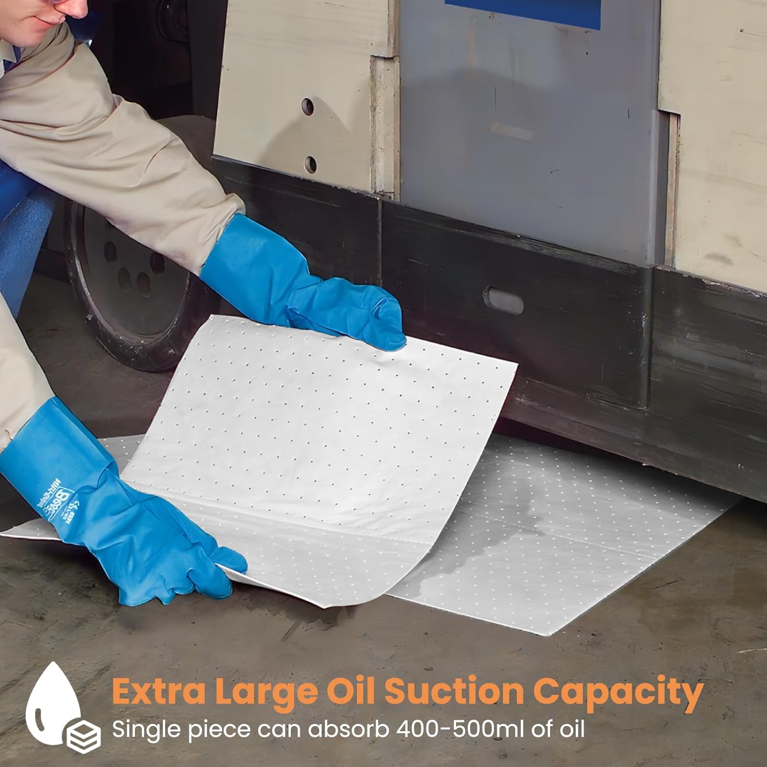 - OIL SPILL NEEDS: Available in 50pcs 17.5β x 13.5β Oil Absorbent Pads Heavyweight effectively absorb up to 24 ounces of oil per pad, for a total absorption of 8 gallons. Providing you with an ample supply for any spills or leaks.