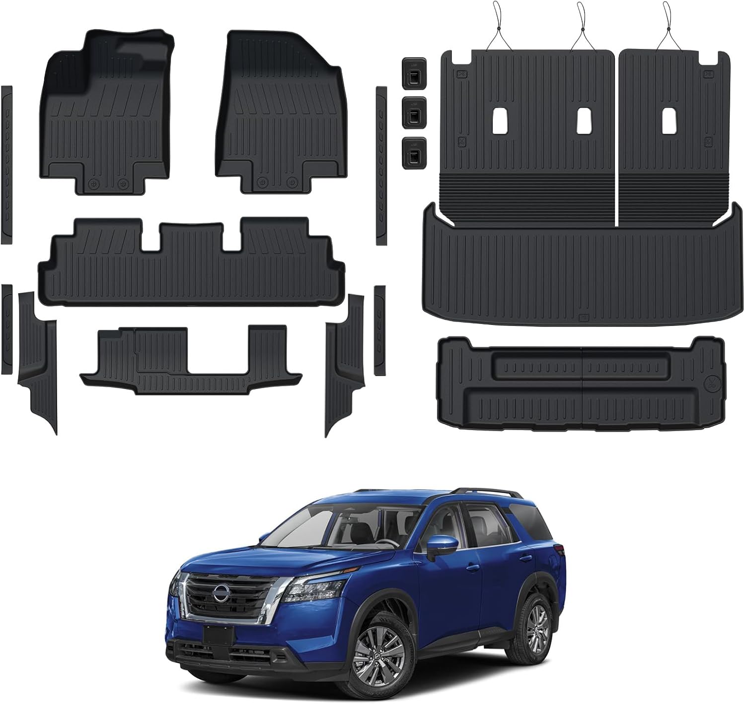 - Custom Fitment: Precisely designed with 3D laser scanning technology for 2022-2025 Nissan Pathfinder 7/8 seats Accessories. Includes 1st & 2nd row floor mats, cargo mat with backrest mats, trunk lower mat and 4PCs door sill guards – 30% more components than standard sets