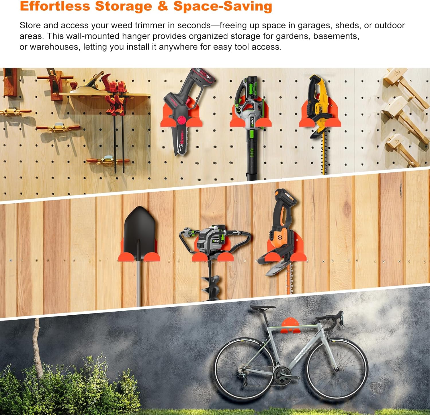 - 【Ultra-Sturdy & Rust-Proof】 Made of high-quality steel, this trimmer rack supports up to 300lbs without bending. The wall mount organizer orange powder-coated surface provides weatherproof & rust-resistant protection, ensuring long-lasting durability.
