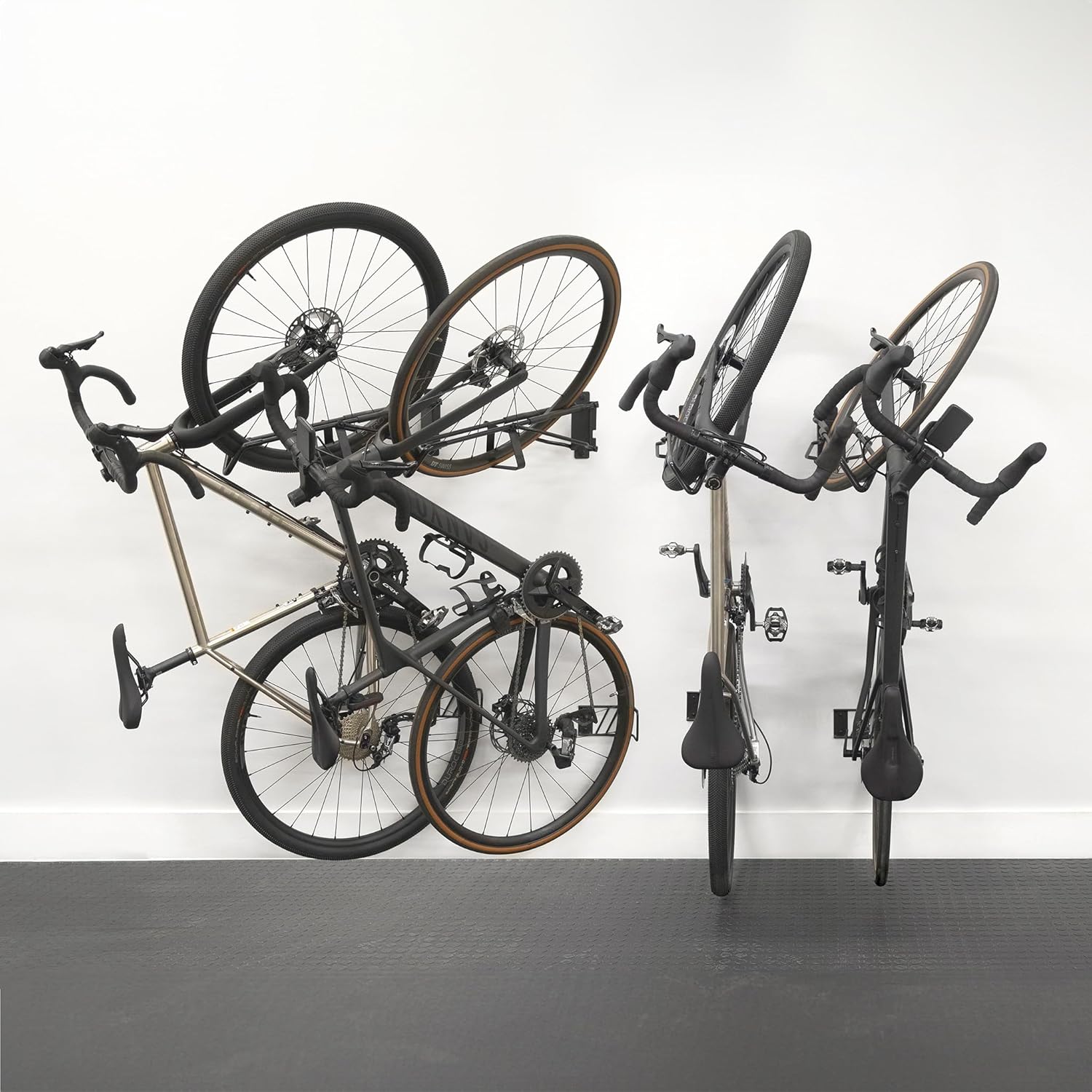 - 4-Pack Bike Rack Wall Mount: Organize road and gravel bikes flat against the wall with this 4 pack vertical bike rack. It holds all bikes with tires between 18 mm and 45 mm wide. From your lightest carbon frame to your heaviest e-bike, keep your bike adventure-ready.