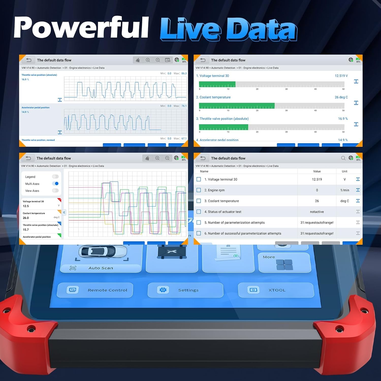 - Powerful All System Diagnostic Scanner for Cars & Trucks: More than a universal obd2 code reader. XTOOL D7X Diagnostic Scanner is a Professional automotive diagnostic tool that provides full access to all available vehicle systems. It lets you read and clear trouble codes, view live data and run active tests across vehicle systems—including ECM, ABS, TPMS, BMS, EPB, Fuel System, A/C, etc. With auto scan, the D7X full system obdii diagnostic scan tool can perform complete system scan in minutes. It is a live data scanner for cars, enabling you view engine RPM, fuel trim, transmission oil temp and more in graphs, and up to 8 pids charts, making diagnostics visual and easy to follow.