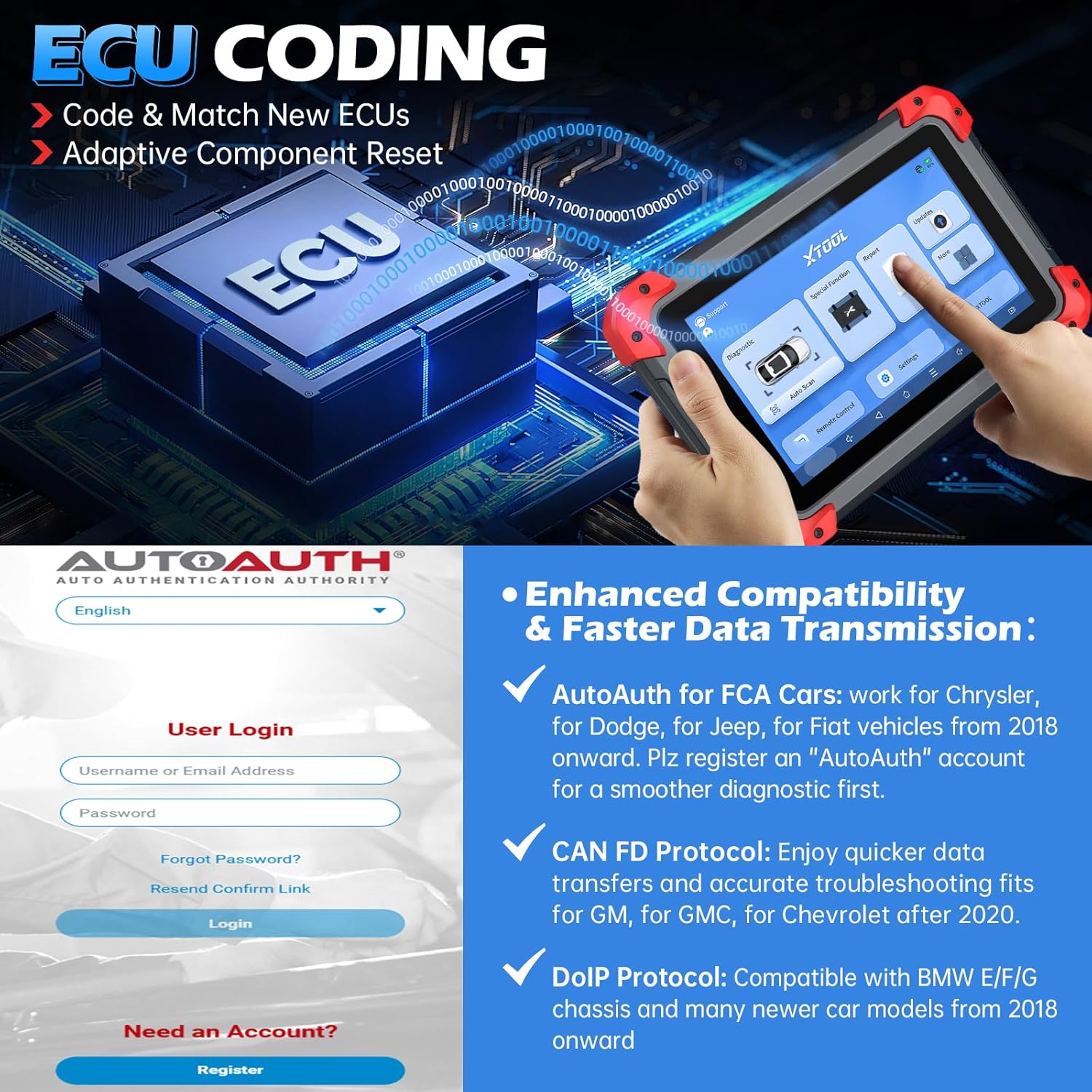 - ECU Coding Scan Tool & DoIP Protocol: Go Beyond basic scanning, the XTOOL D7X auto scanner offers ECU Coding for BMW, for Benz, for Mitsubishi,allowing ecu coding, adative resetting, and module matching after repairs, this car fault tester also supspports DOIP protocol(for BMW, for Mercedes-Benz and more),enabling high-speed data transmission for faster and more precise diagnostics