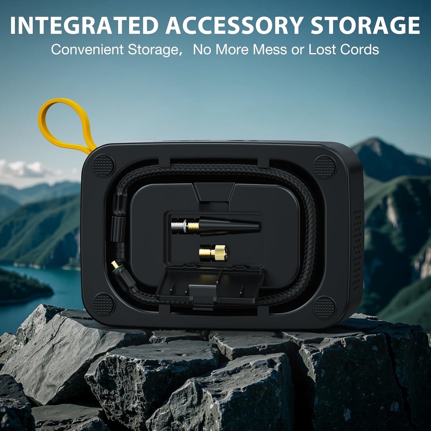 - Ultra Long Power Cord and Portable Storage: This car tire pump is equipped with a 0.5m long (1.6ft) air hose and a 3m long (9.8ft) power cord, making it easy to connect to any tire. The integrated storage box on the back facilitates the storage of accessories, making the tire pump more portable. This convenient design brings a relaxed and convenient inflation experience.