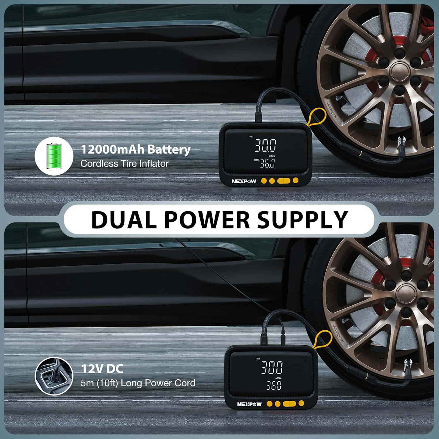 - Dual Power Mode and Auto Shut-Off: This car tire air pump portable is equipped with a 12000mAh rechargeable battery and features a wireless design for easy inflation, bringing flexible portability to your journey. At the same time, it is equipped with a 12V DC adapter as a backup power source, so you don't have to worry about the battery running out during the journey, making it an ideal solution for emergency situations during the journey. In addition, the tire inflator also has an automatic shut-off function. After reaching the preset pressure value, the tire inflator will stop working.