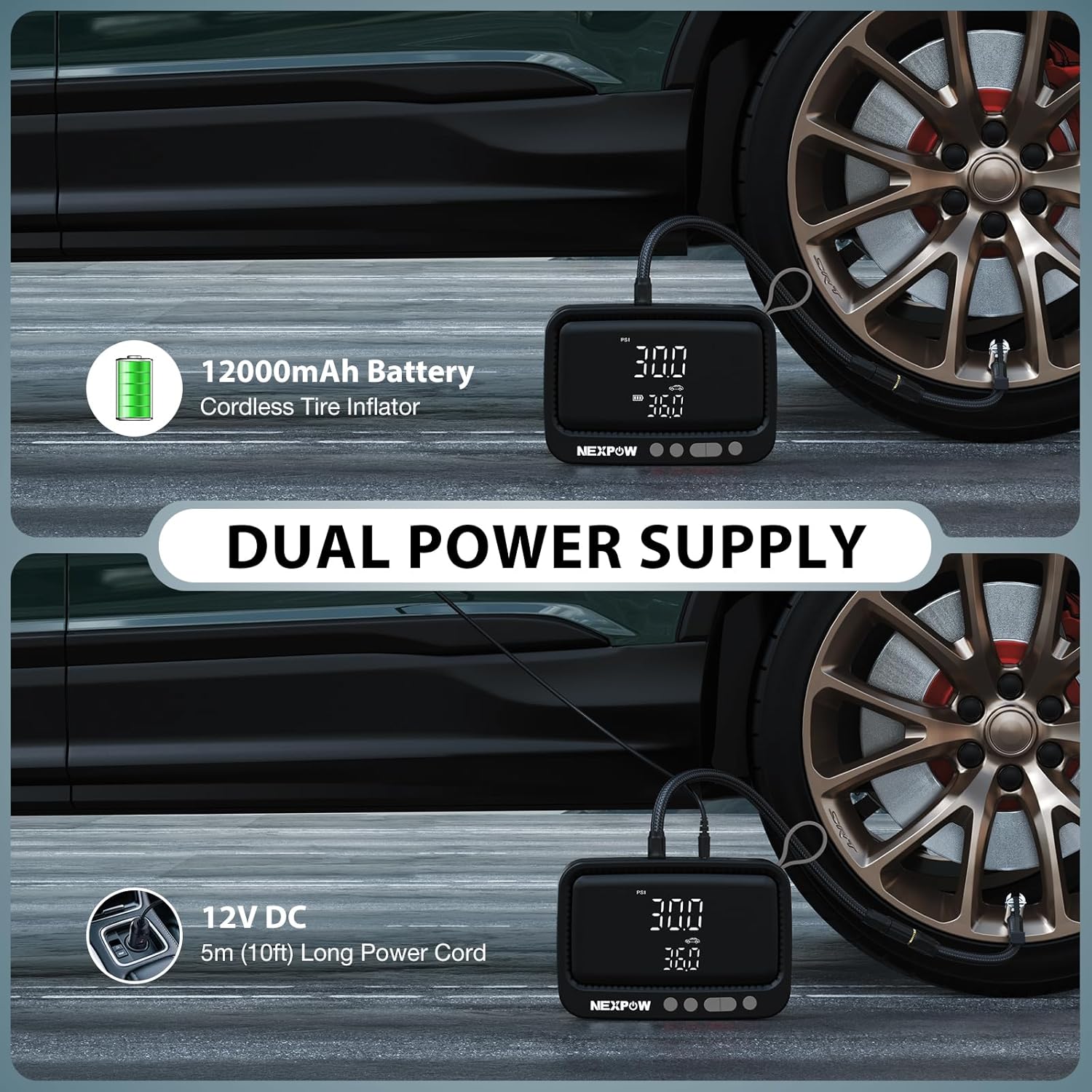 - Dual Power Mode and Auto Shut-Off: This car tire air pump portable is equipped with a 12000mAh rechargeable battery and features a wireless design for easy inflation, bringing flexible portability to your journey. At the same time, it is equipped with a 12V DC adapter as a backup power source, so you don't have to worry about the battery running out during the journey, making it an ideal solution for emergency situations during the journey. In addition, the tire inflator also has an automatic shut-off function. After reaching the preset pressure value, the tire inflator will stop working.