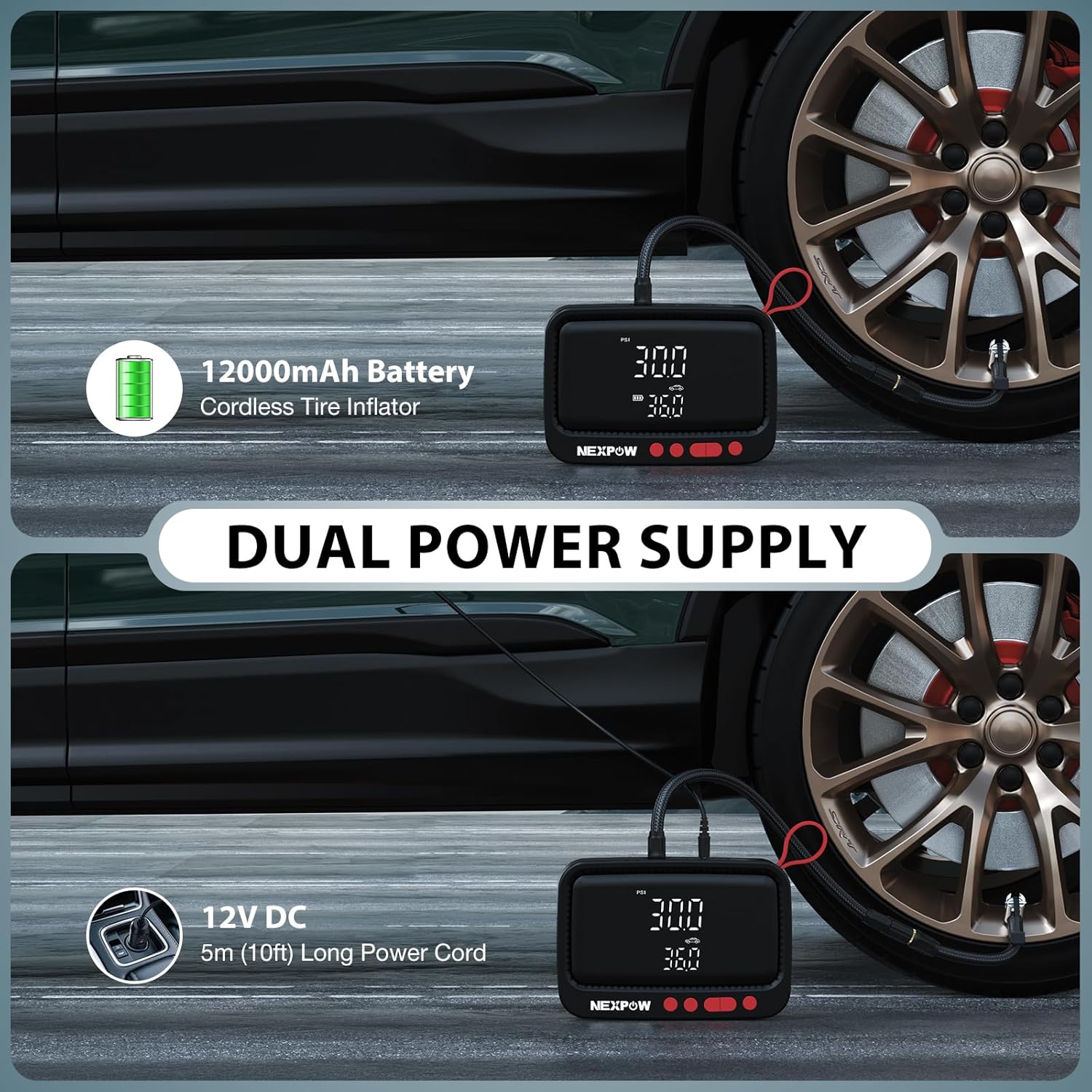- Dual Power Mode: This car tire air pump portable is equipped with a 12000mAh rechargeable battery and features a wireless design for easy inflation, bringing flexible portability to your journey. At the same time, it is equipped with a 12V DC adapter as a backup power source, so you don't have to worry about the battery running out during the journey, making it an ideal solution for emergency situations during the journey. In addition, the tire inflator also has an automatic shut-off function. After reaching the preset pressure value, the tire inflator will stop working.