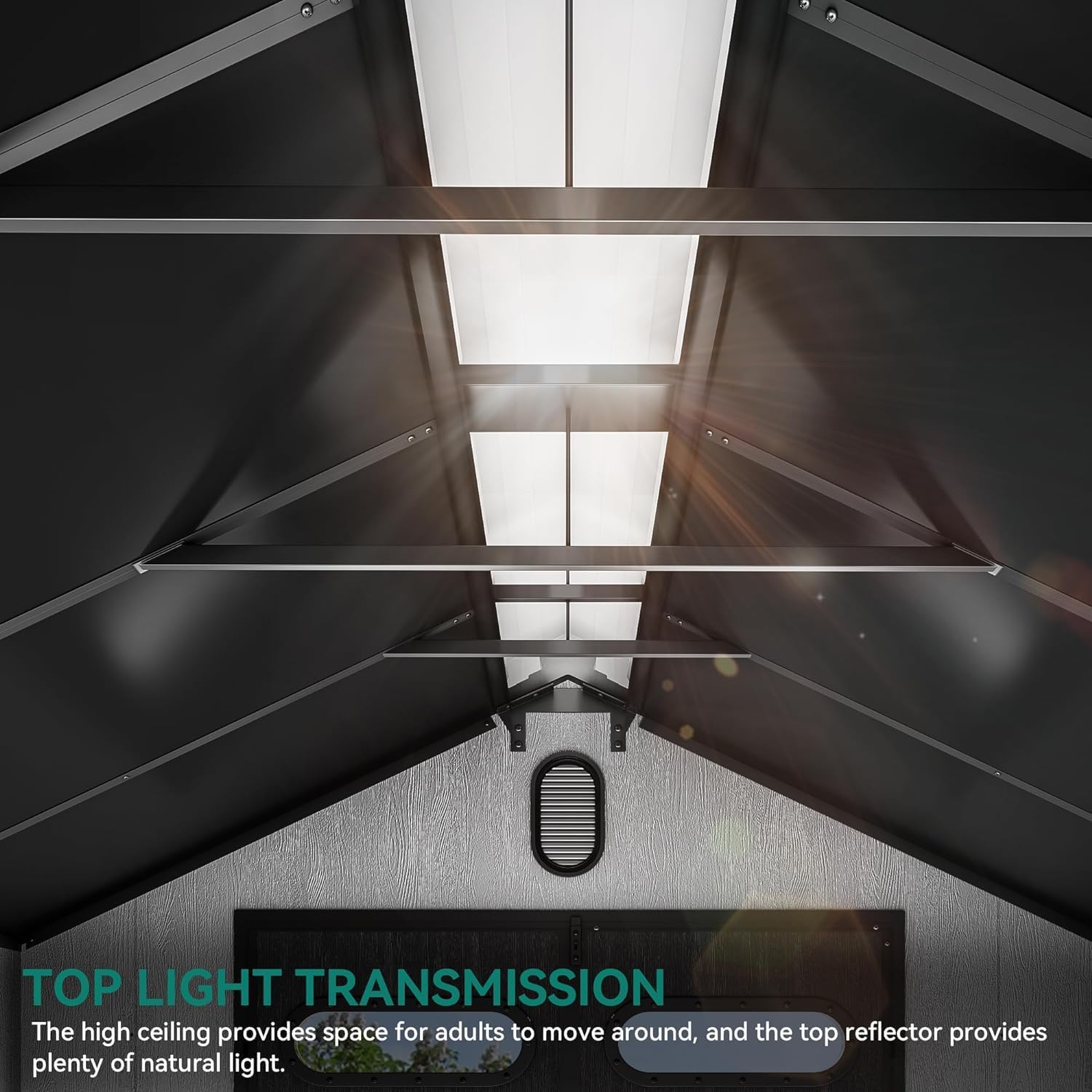 - Ventilation & Transmission: The garden shed features theft-deterring security; Skylights and translucent panels admit natural illumination, while vented windows facilitate airflow to prevent humidity issues; The angled roof channels rainwater drainage, enhancing the unit's longevity